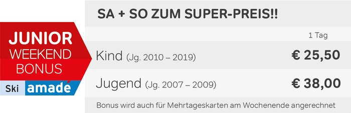 - Ski amadé Skipasskauf für mindestens einen Elternteil sowie die ersten beiden Kinder bzw. Jugendlichen für denselben Gültigkeitszeitraum erforderlich!