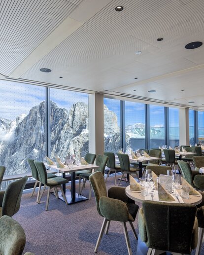 V regionu kolem Dachsteinu je na gastronomii kladen velký důraz! Přímo u horní stanice lanové dráhy Dachstein-Gletscherbahn se nachází jedinečná ledovcová restaurace. Ve výšce 2.700 metrů nad mořem okouzlí své hosty snovým výhledem a vynikajícím jídlem. Ať už máte chuť na speciality z regionu, rozmanitou denní nabídku či chutnou svačinku neboli „Jause“, pro každého se tu něco najde. Restauraci nedělá výjimečnou jen nadmořská výška, ale i skutečnost, že její střed protíná i hranice spolkových zemí Horní Rakousko a Štýrsko.