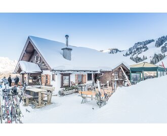 A beautiful wintery mountain panorama promises Höchalm-Adlerhorst Hut, which lies at the foot of the Rosskopf in Zauchensee. Here you can enjoy either in the cozy lounges or on the sun terrace with local "specialties".