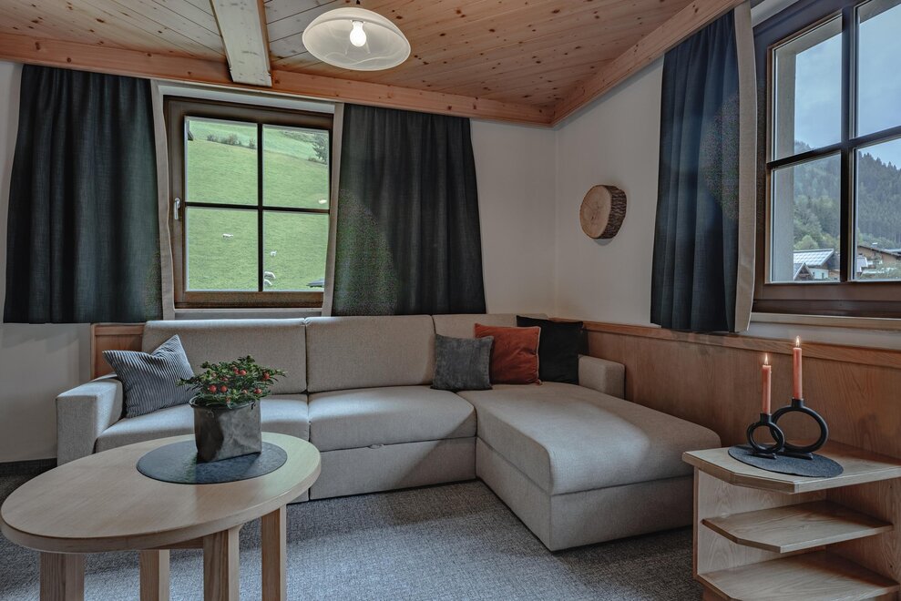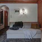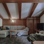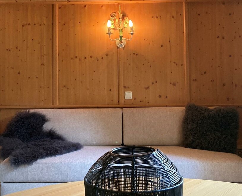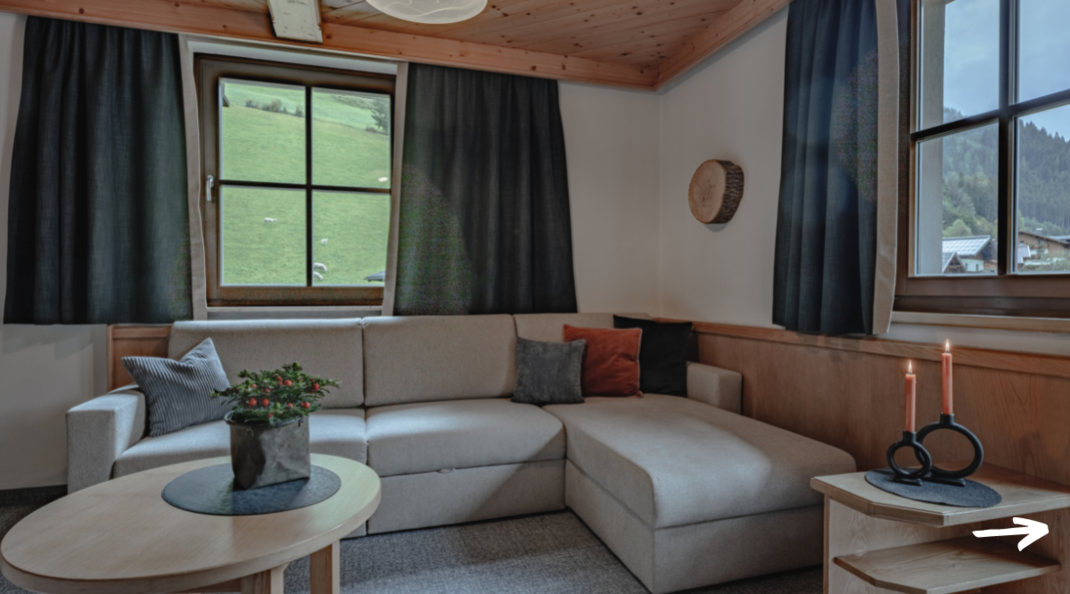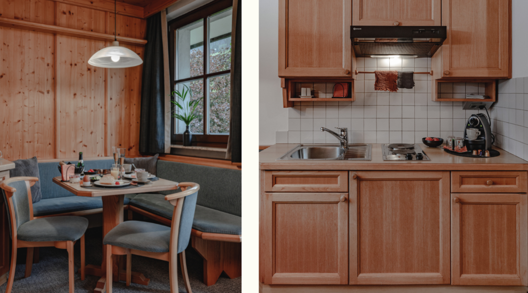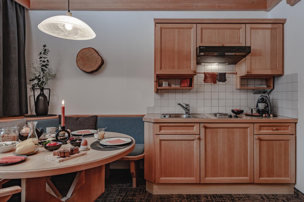 Ložnice s manželskou postelí, obývací/pokoj s rozkládací pohovkou, sedací kout, vysokorychlostní WLAN, kabelová televize | Kuchyňský kout: lednička s mrazákem, mikrovlnná trouba, rychlovarná konvice, kávovar Nespresso, 2 vařiče, dřez, nádobí a příbory, čisticí prostředek na nádobí, set soli a pepře, cukřenka | malá koupelna se sprchou a WC | balkon na západ | Apartmán Lärche pro až 3 osoby, 28 m²