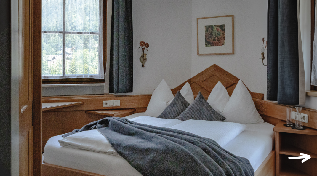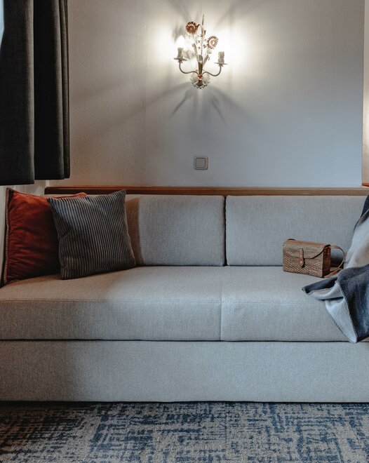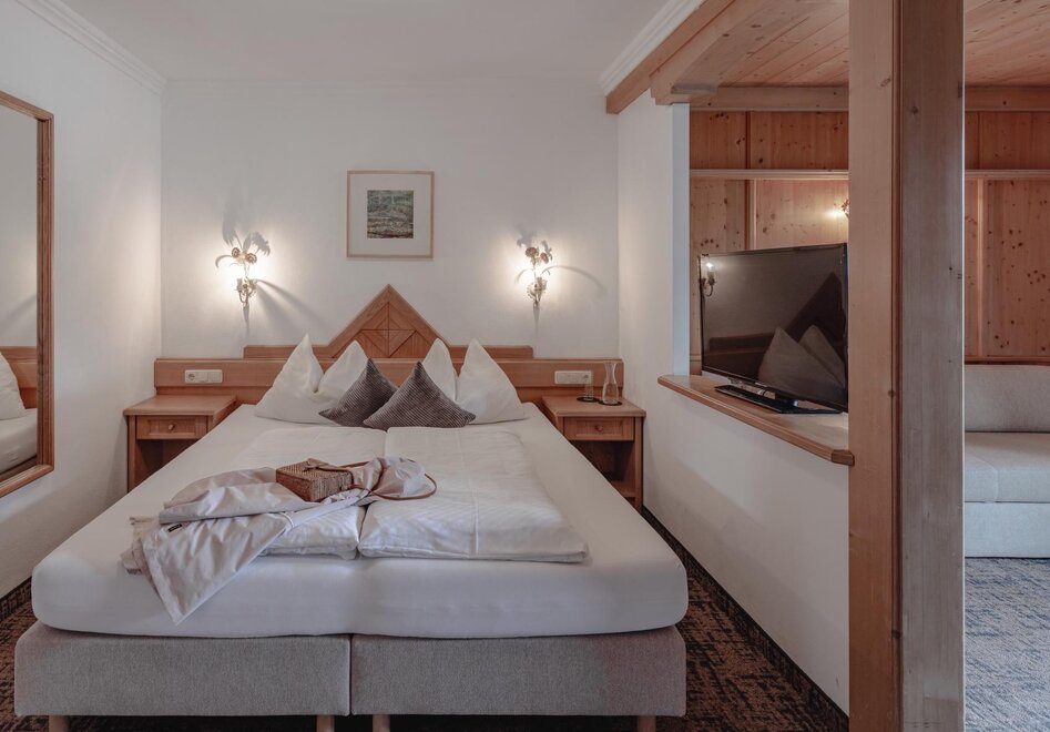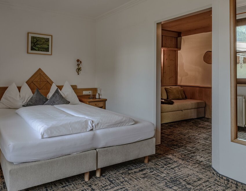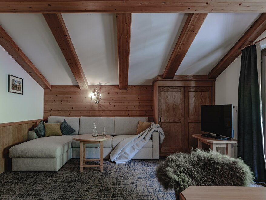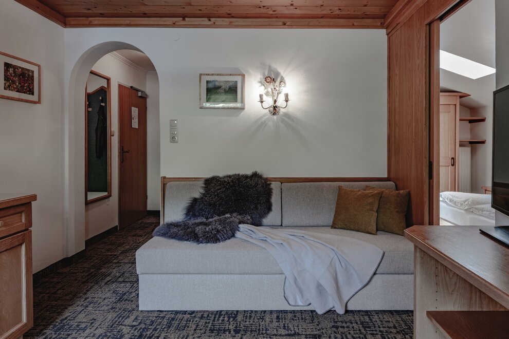 Ložnice s manželskou postelí, obývací/pokoj s rozkládací pohovkou, sedací kout, vysokorychlostní WLAN, kabelová televize | Kuchyňský kout: lednička s mrazákem, mikrovlnná trouba, rychlovarná konvice, kávovar Nespresso, 2 vařiče, dřez, nádobí a příbory, čisticí prostředek na nádobí, set soli a pepře, cukřenka | malá koupelna se sprchou a WC | balkon na západ | Apartmán Lärche pro až 3 osoby, 28 m²