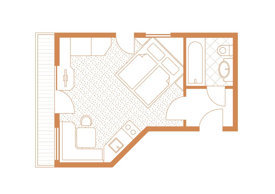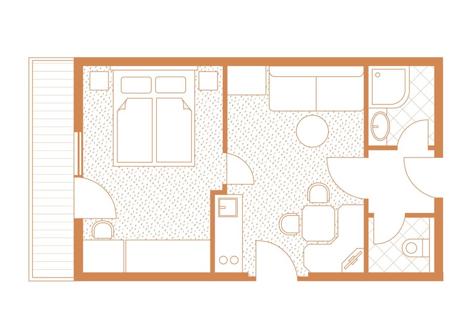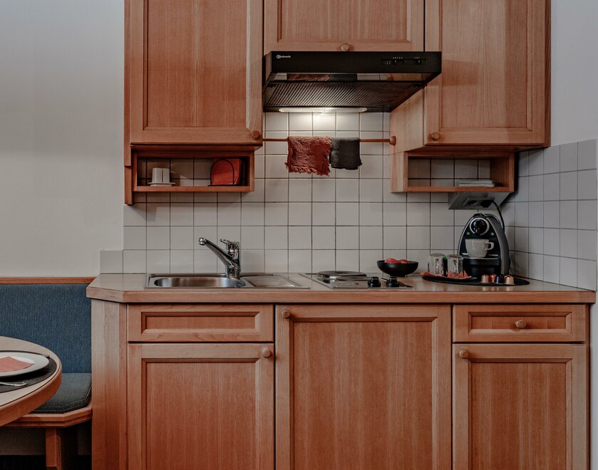 Obývací/spací pokoj s manželskou postelí, obývací kout, vysokorychlostní WLAN, kabelová TV | Kuchyňský kout: lednice s mrazákem, mikrovlnná trouba, rychlovarná konvice, kávovar Nespresso, 2 varné plotýnky, dřez, kuchyňské a jídelní nádobí, prostředek na mytí nádobí, sůl a pepř, cukřenka | Koupelna se sprchovou vanou a WC | Balkón orientovaný na západ | Apartmán Ahorn pro až 2 osoby, 22 m²