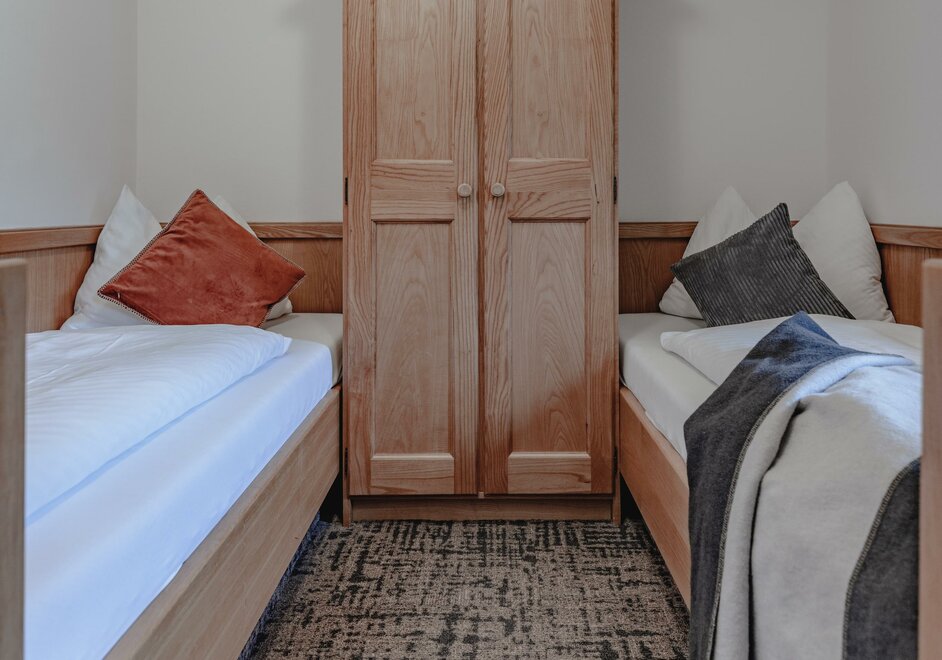 Ložnice s manželskou postelí | pokoj pro mládež se dvěma jednolůžkovými postelemi | obývací pokoj s rozkládací pohovkou, posezením, vysokorychlostní WLAN, kabelová TV | Kuchyňský kout: lednice s mrazničkou, mikrovlnná trouba, rychlovarná konvice, Nespresso kávovar, 2 varné desky, dřez, kuchyňské a jídelní nádobí, mycí prostředek, sůl a pepř, cukřenka | Koupelna se sprchovou vanou a WC | balkon orientovaný na západ | apartmán Linde pro až 5 osob, 34 m²