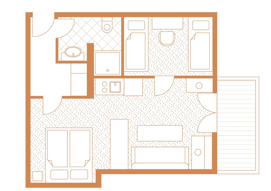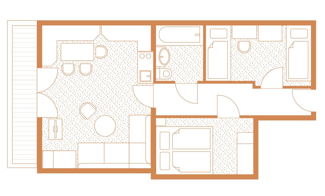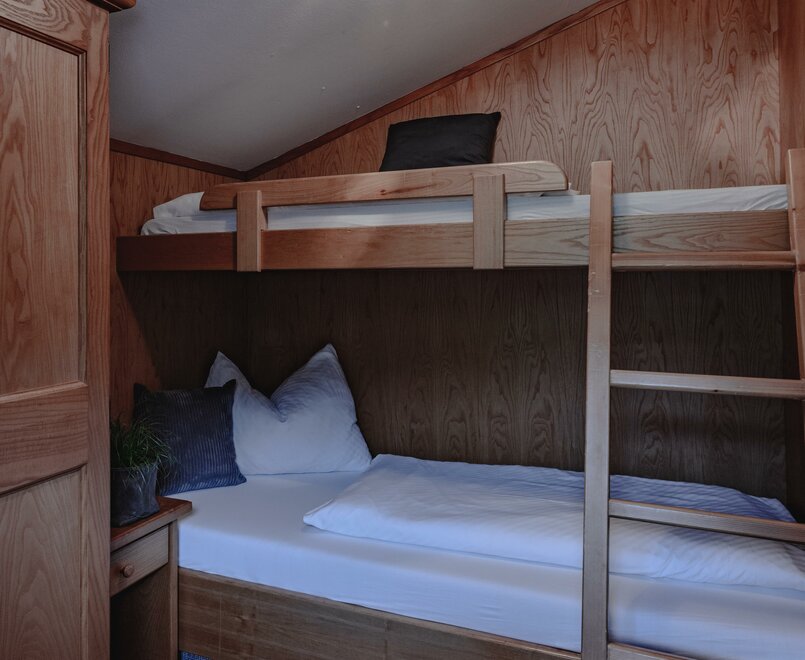 Pokoje pro děti s patrovou postelí | obytný prostor s manželskou postelí, posezení, vysokorychlostní Wi-Fi, kabelová TV | Kuchyňský kout: lednice s mrazákem, mikrovlnná trouba, rychlovarná konvice, kávovar Nespresso, 2 varné desky, dřez, nádobí a příbory, čisticí prostředek na nádobí, sůl a pepř, cukřenka | Koupelna se sprchovou vanou a WC | Balkon orientovaný na západ | Apartmán Kiefer pro až 4 osoby, 31 m²