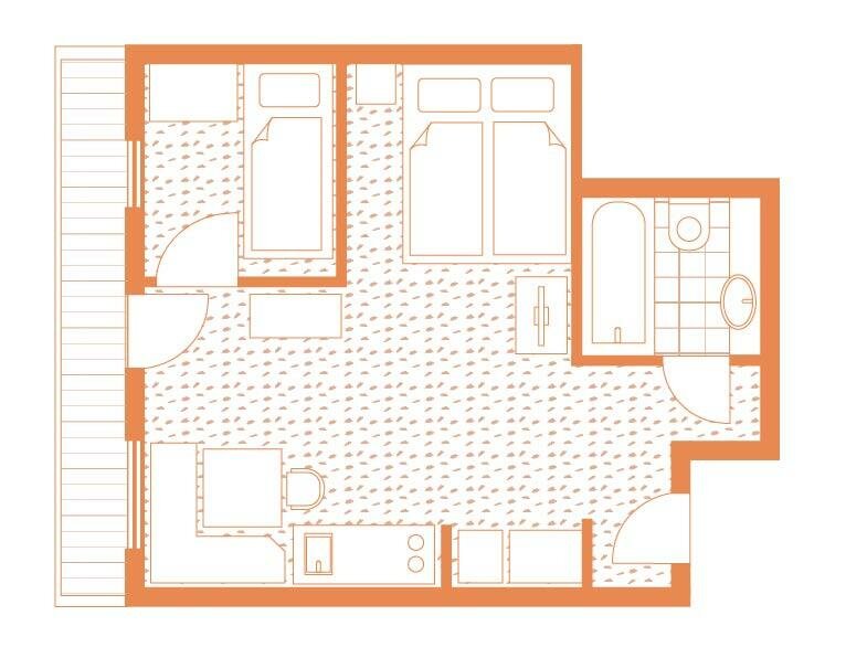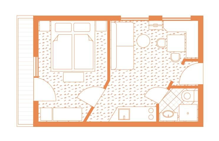 Obývací/pohovkový pokoj s manželskou postelí, rozkládací pohovkou, posezením, vysokorychlostním WLAN, kabelovou televizí | Kuchyňský kout: lednice s mrazákem, mikrovlnná trouba, rychlovarná konvice, Nespresso kávovar, 2 varné desky, dřez, kuchyňské a jídelní nádobí, mycí prostředek, sůl a pepř, cukřenka | Koupelna se sprchovou vanou | samostatné WC | balkon na jih | Apartmán Buk pro až 4 osoby, 31 m²