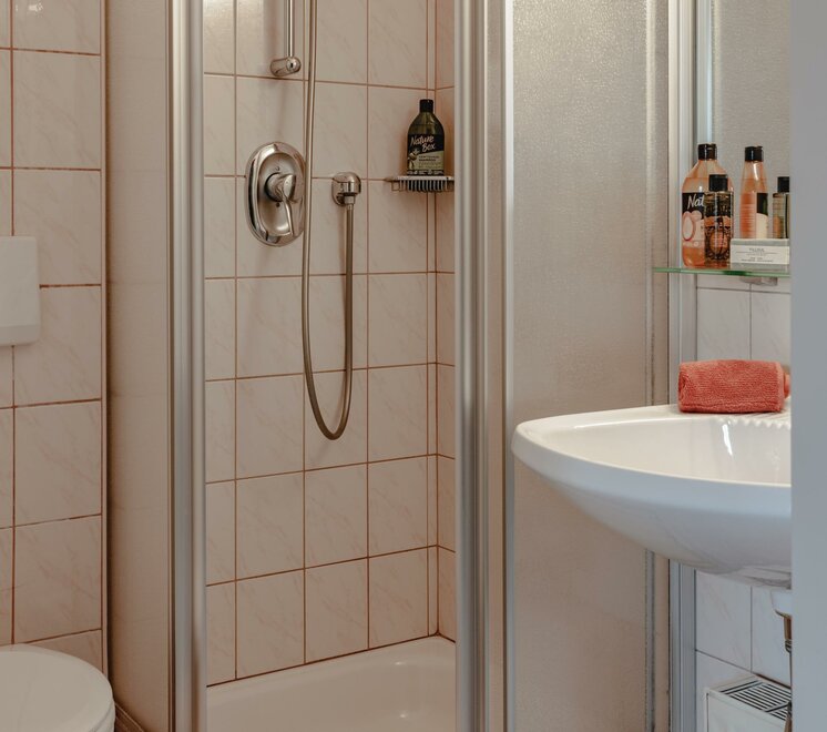 Ložnice s manželskou postelí a vlastní koupelnou se sprchou a WC | obývací pokoj s manželskou postelí, posezením, vysokorychlostním WLAN, kabelovou televizí | Kuchyňský kout: lednice s mrazákem, mikrovlnná trouba, rychlovarná konvice, Nespresso kávovar, 2 varné desky, dřez, nádobí na vaření a stolování, mycí prostředek, set soli a pepře, cukřenka | Koupelna se sprchovou vanou a WC | Balkón na severní straně | Appartement Erle pro až 4 osoby, 37 m²