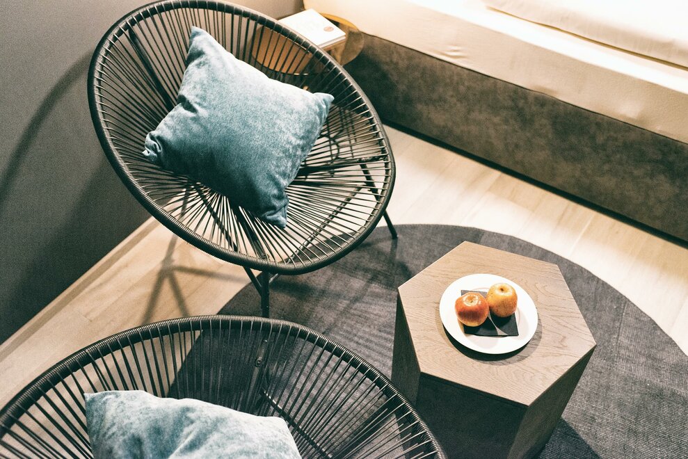 Životní styl pokoj, pohodlná boxspring postel, elegantní dřevěná podlaha, útulné křesla, koupelna se světelnými sprchami & zvukovými boxy, plochá obrazovka TV, Wi-Fi & odpočinková lounge na balkoně.Vybavení pokojů