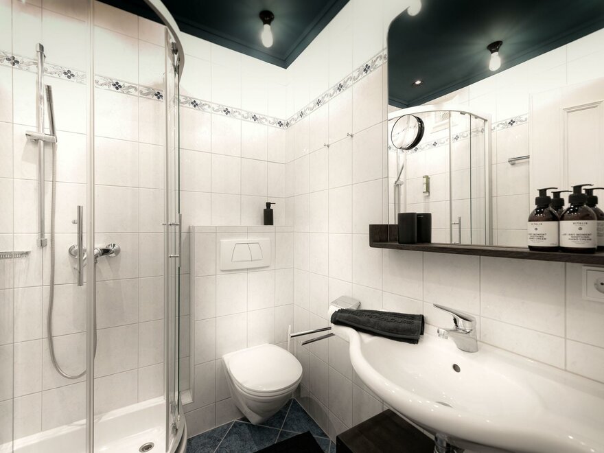 prostorná rodinná koupelna se sprchou a samostatným WC