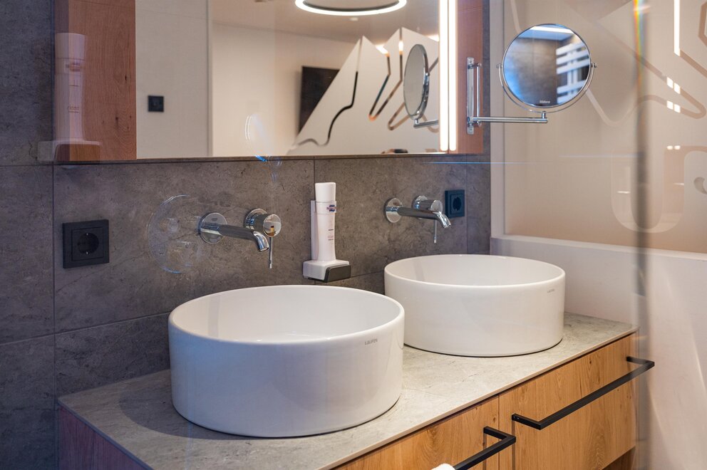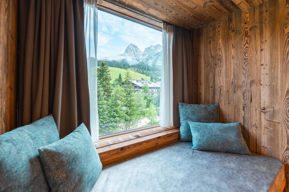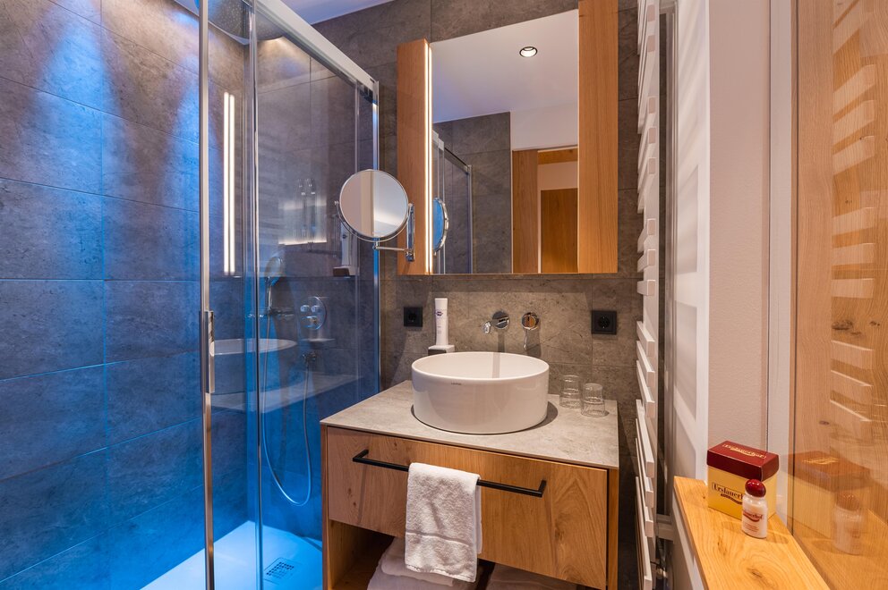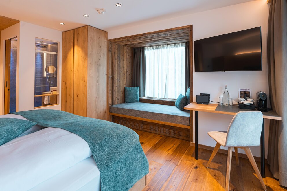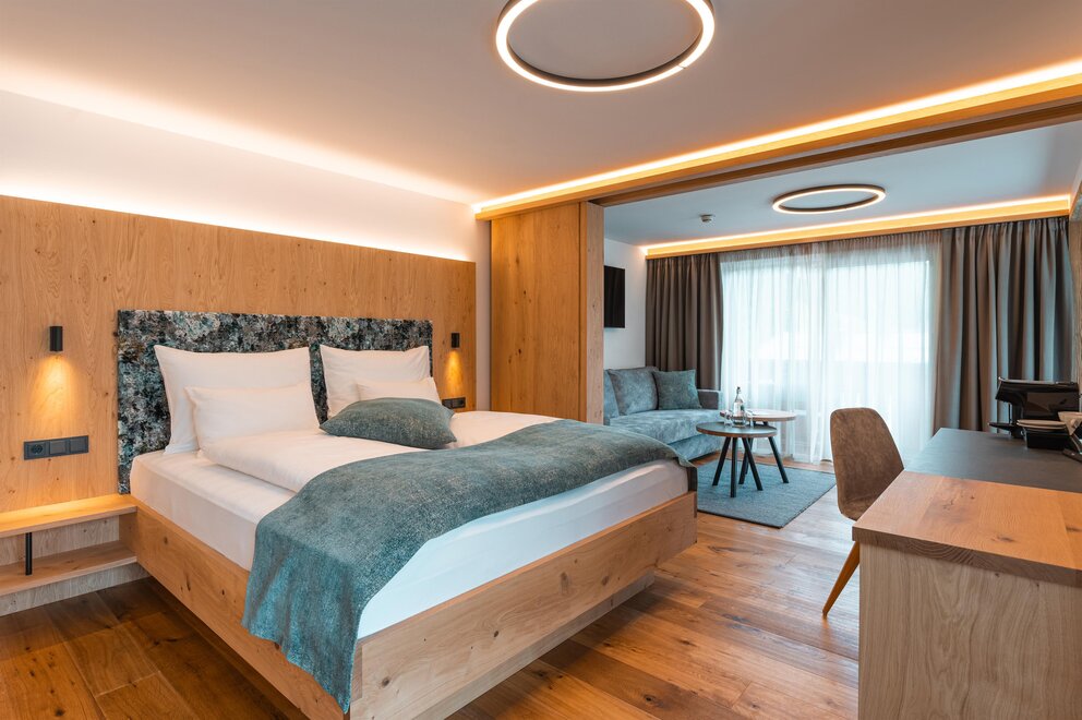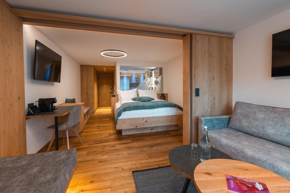 Světly rodinný pokoj pro 1-4 osoby (cca 33 m²) s balkonem a výhledem na okolní horskou krajinu. Moderní vybavení a alpský šarm zajišťují příjemné dny dovolené na Hochkönigu. Rozkládací přepážka poskytuje dva samostatné spací prostory.
