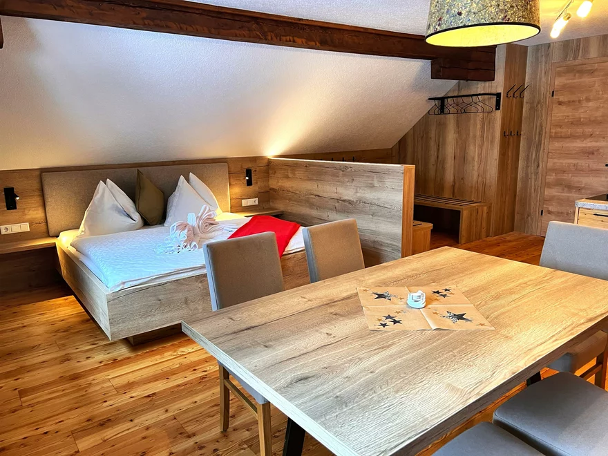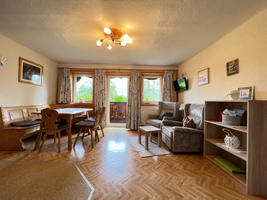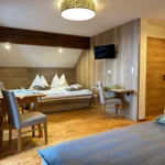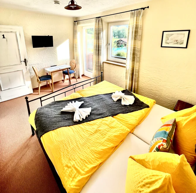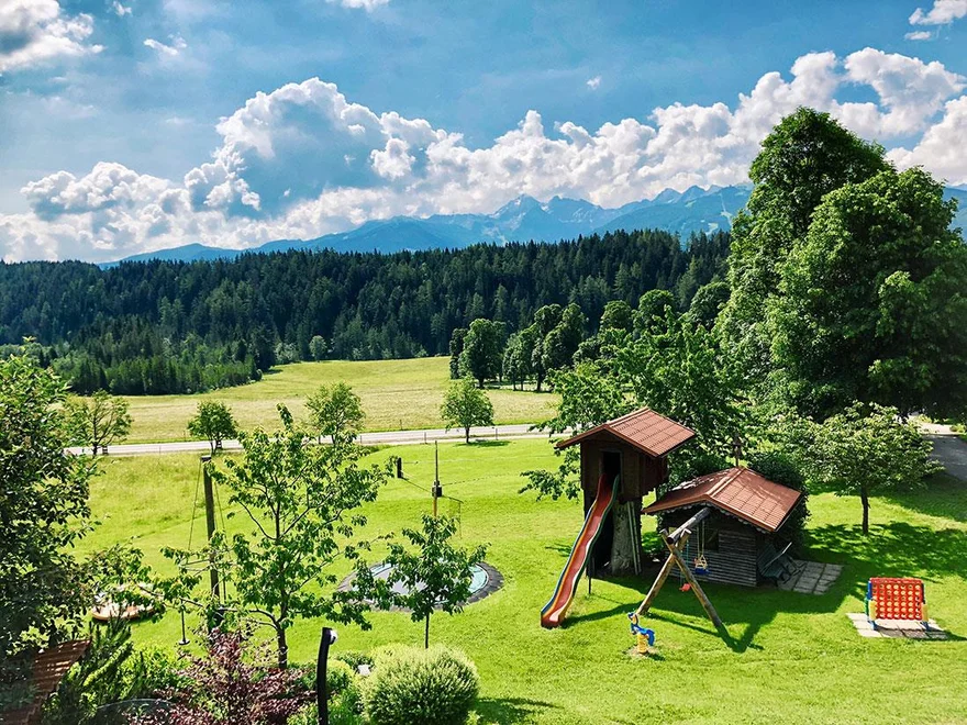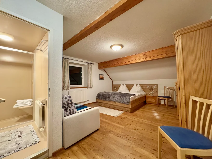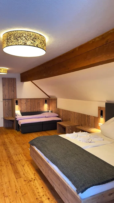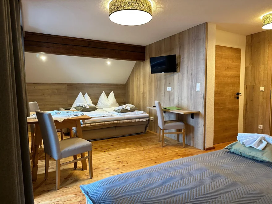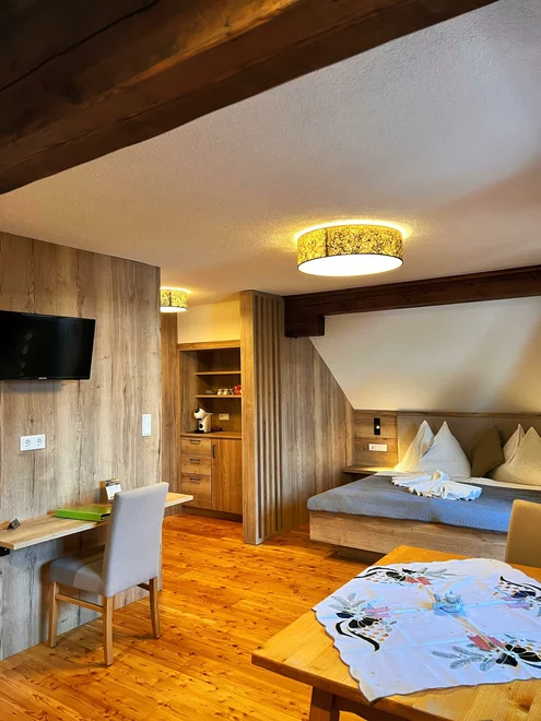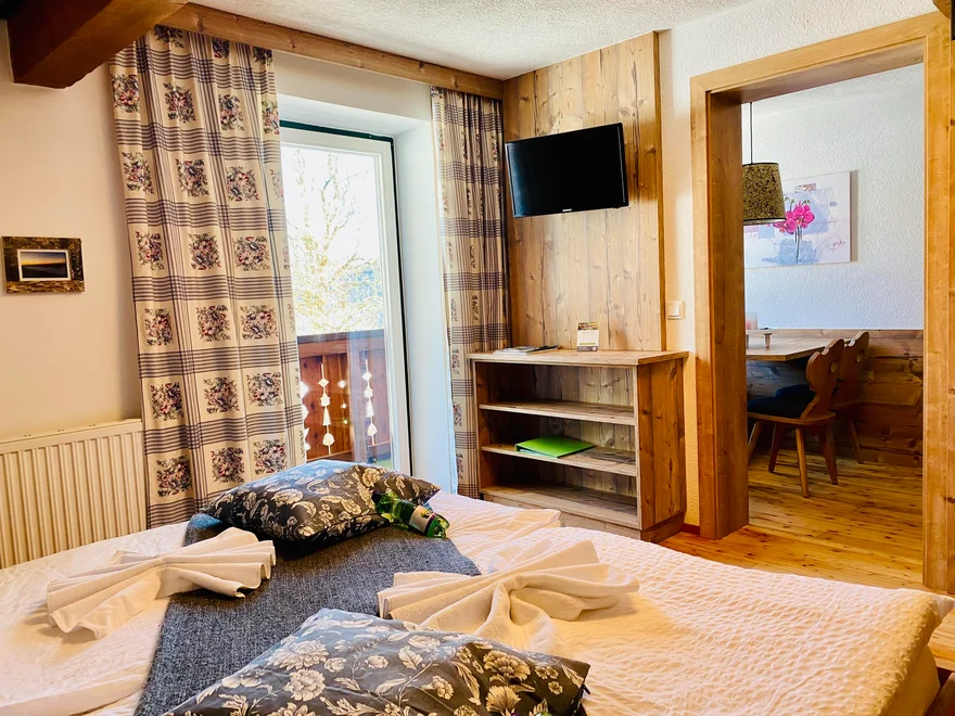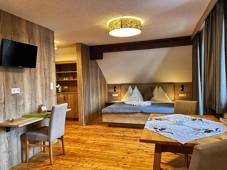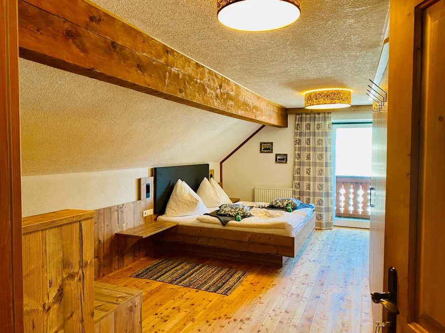 Pěkně zařízené pokoje mají všechny samostatnou koupelnu a oddělený prostor k sezení s kávovarem, kde najdete dostatek místa a prostoru na příjemné posezení u kávy. Z balkonu si vychutnáte nádherný výhled na naši skvělou zahradu, na Schladminger Tauern a na úchvatné horské pozadí Dachstein.