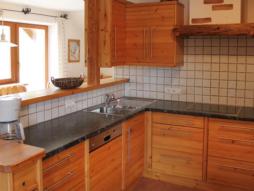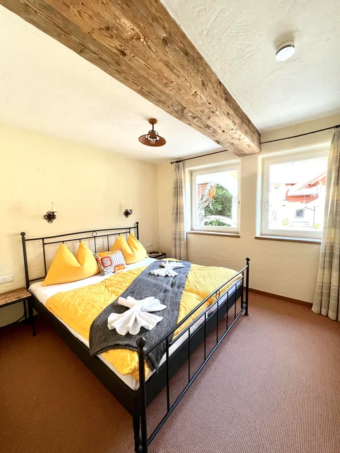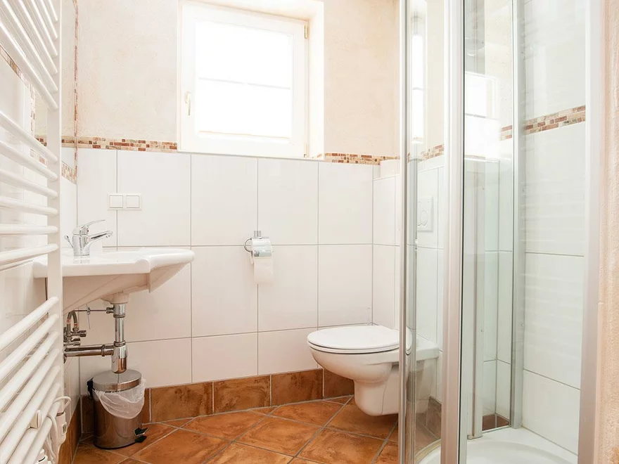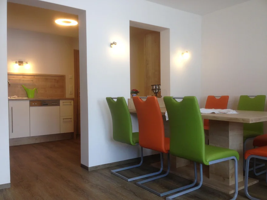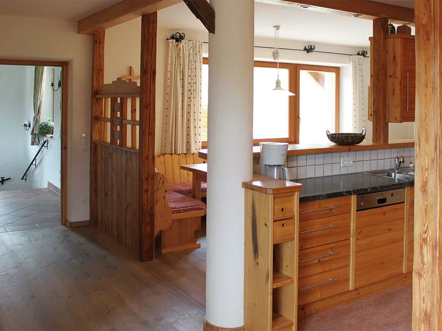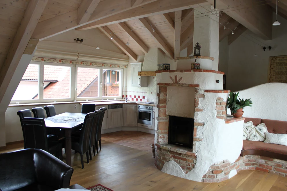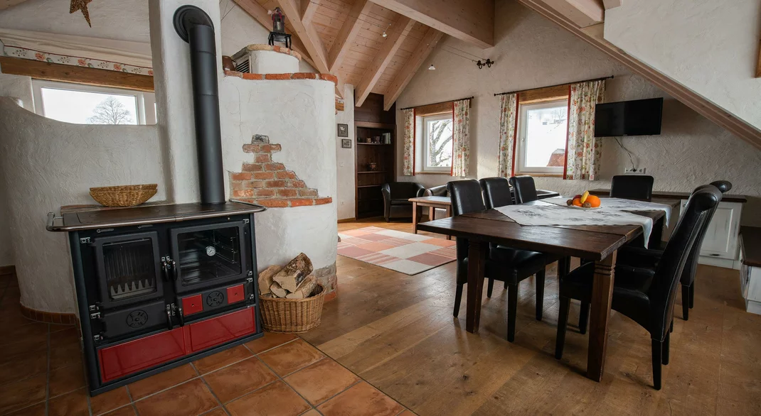 Rekreační dům 160 m² velký rekreační byt v selském stylu pro 8-11 osob max 12 osob; 2 dvoulůžkové pokoje s sprchou/WC, 1x čtyřlůžkový pokoj, + 2 rozkládací pohovky možné. Obývací prostor s velkou kuchyní - plně vybavenou (myčka, mikrovlnka, elektrický sporák a trouba) elektricky vyhřívaný kachlový sporák, plochá obrazovka TV; Wi-Fi, velká západní terasa, jižní a východní balkon; nekuřácký dům!