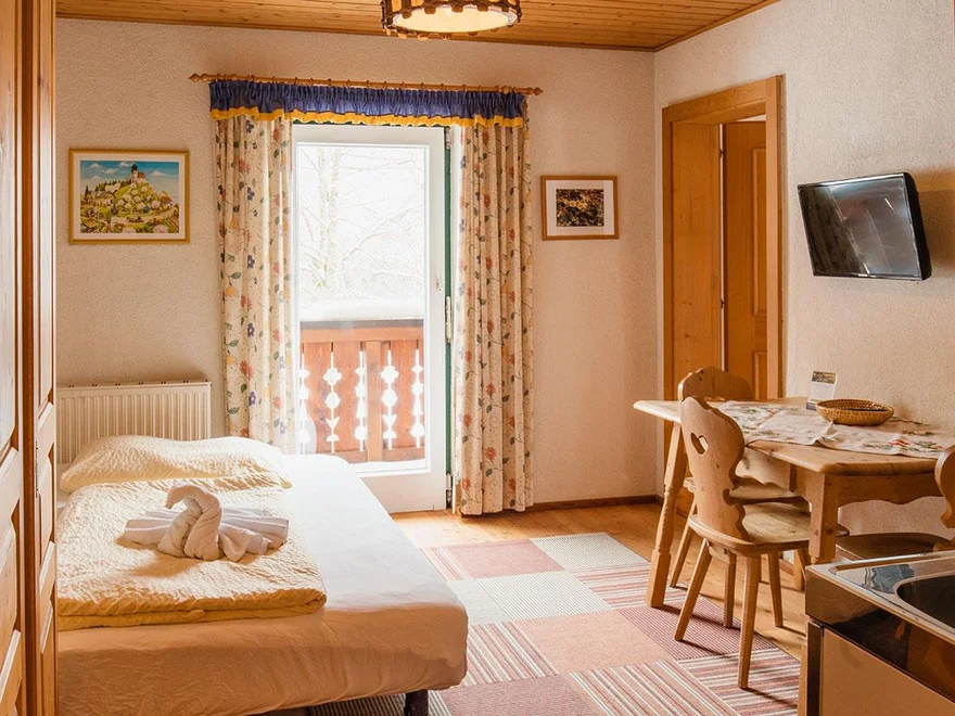 Prijemné rodinné pokoje o velikosti cca 40-45 m², s výhledem na bazén a hory - pro 2-4 osoby. Rustikální a velmi vřelé, útulně jednoduše zařízené! S kuchyňským koutem (2 varné desky, lednice s mrazničkou, dřez), balkonem, sprchou/WC, plochou obrazovkou, zdarma Wlan!