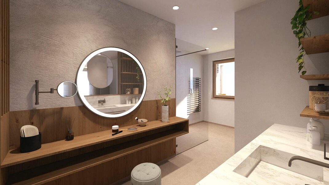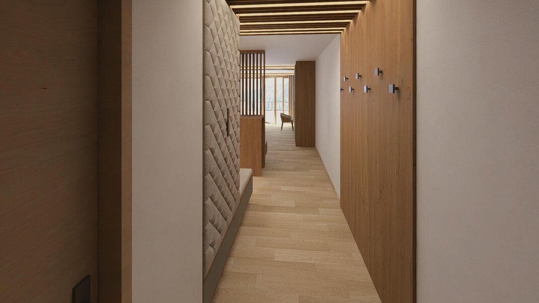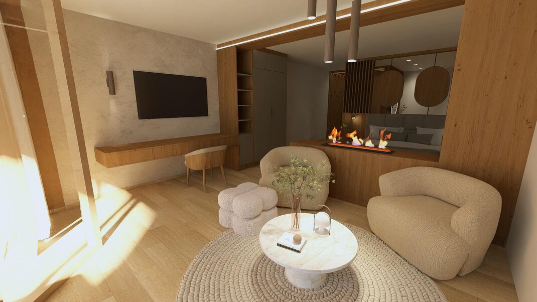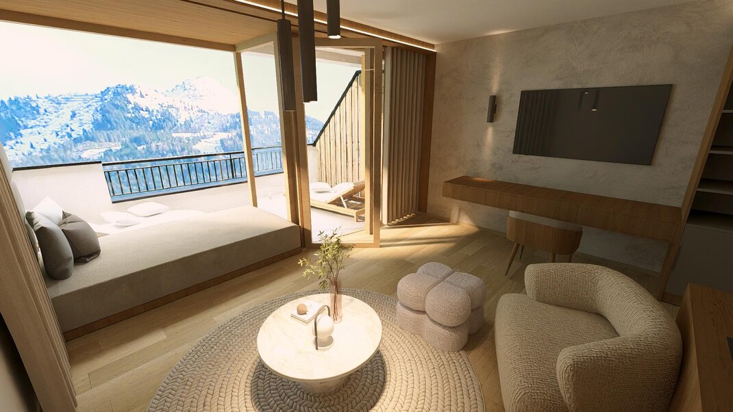 Alpin-modern luxury living dream with a lot of beautiful details and wood floor, dreamlike living room with coolfire stove and big southwest balcony, bathroom with steam shower & freestanding bathtube with mountain view, sleeping room plus a second small sleeping room with extra toilet, minibar