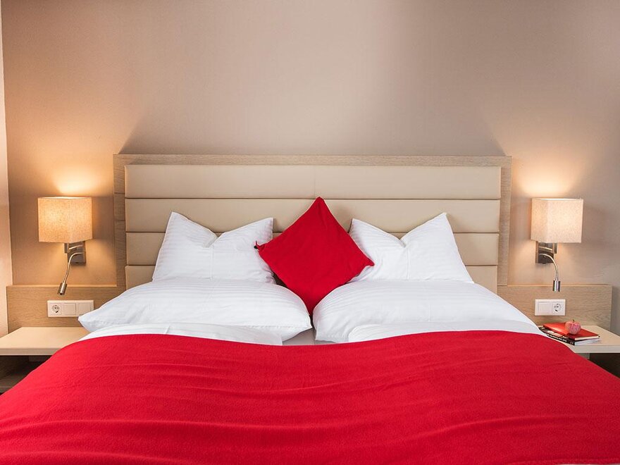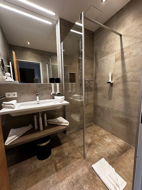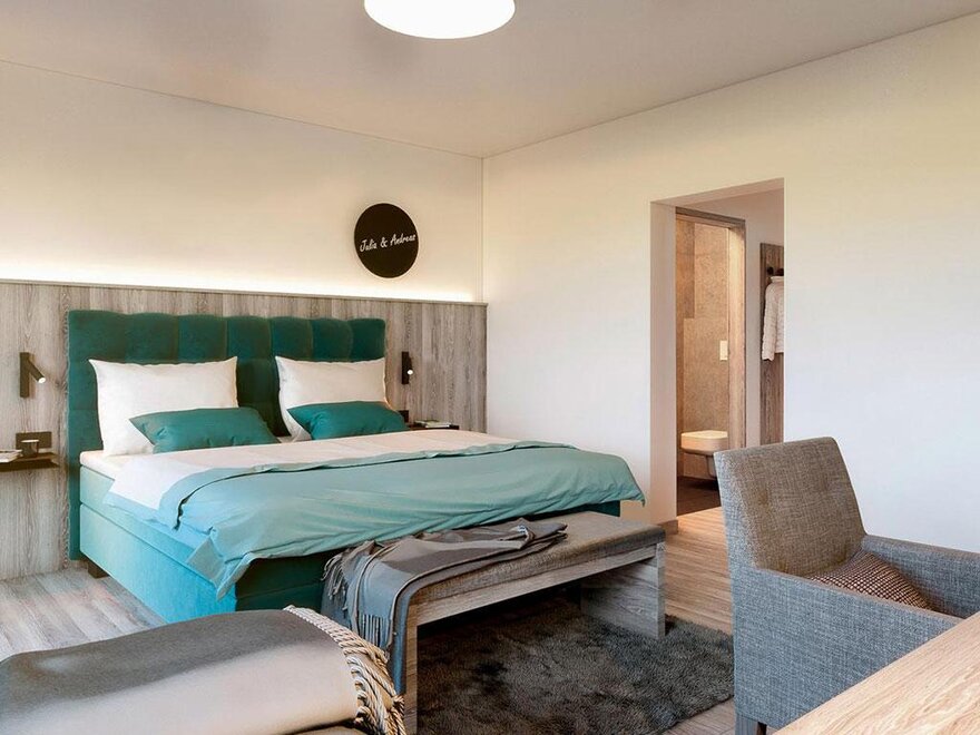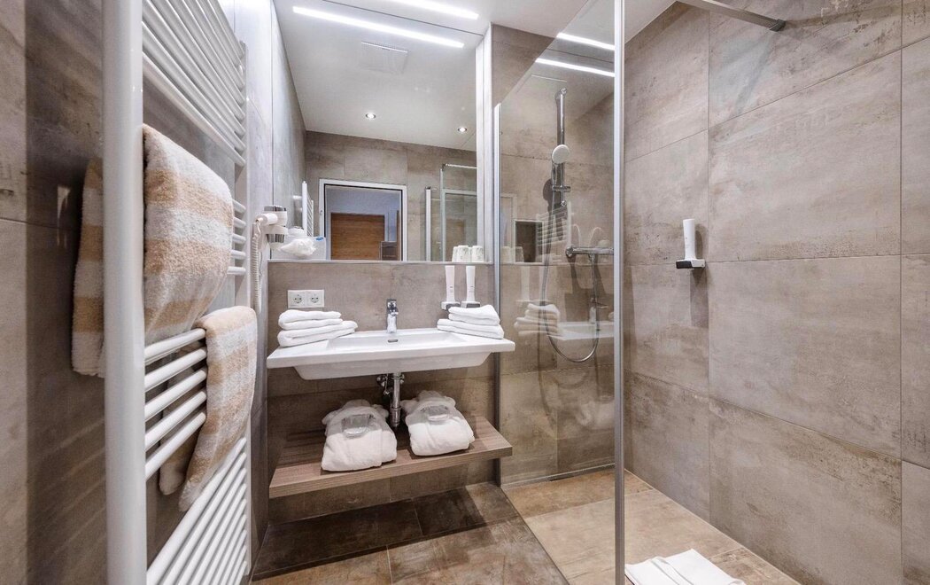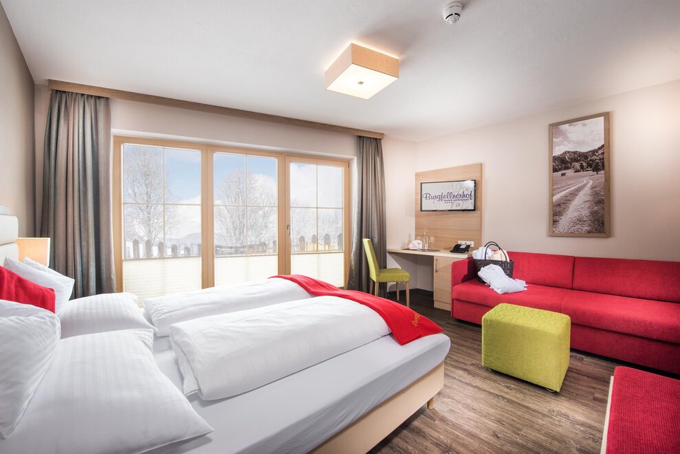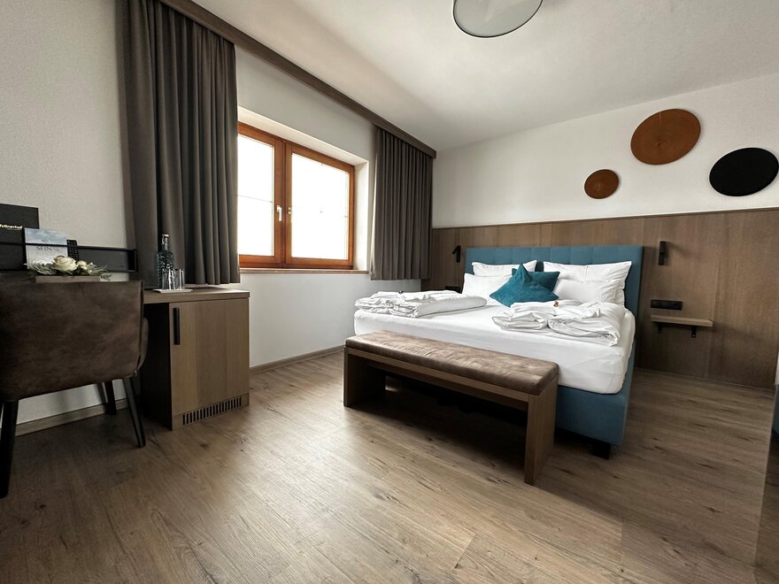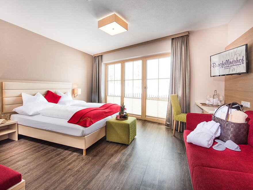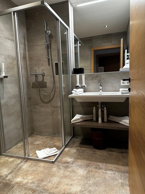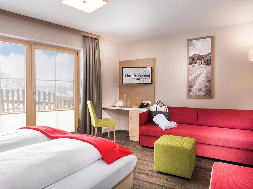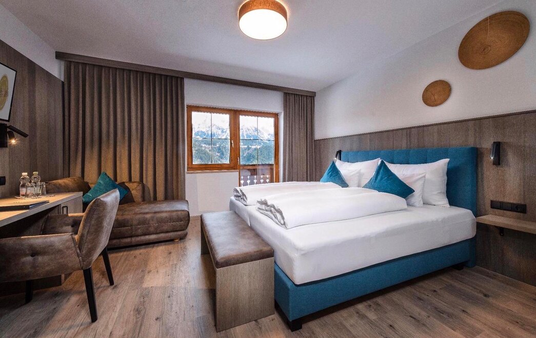 Junior Suite má samostatnou obývací a spací část, prostornou koupelnu a balkon nebo terasu s výhledem na hory.