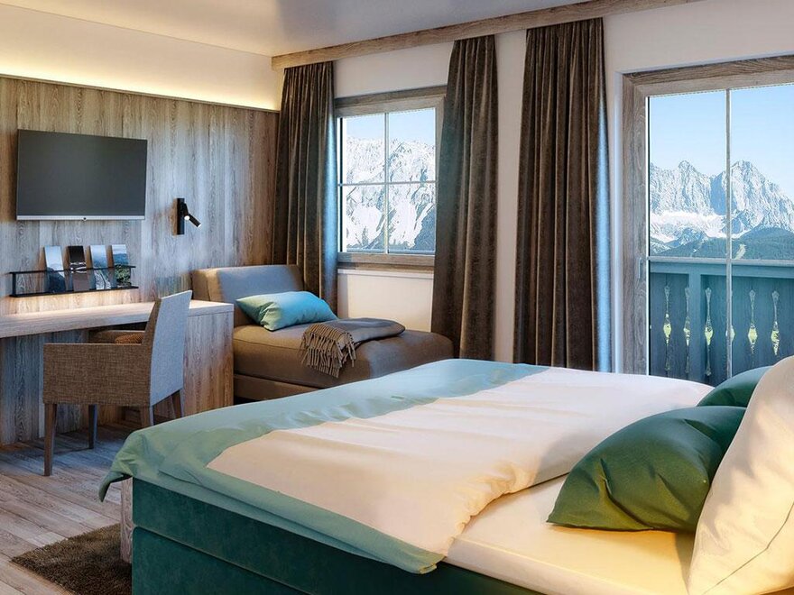 Prostorný pokoj s balkonem nebo terasou a výhledem na Dachstein.