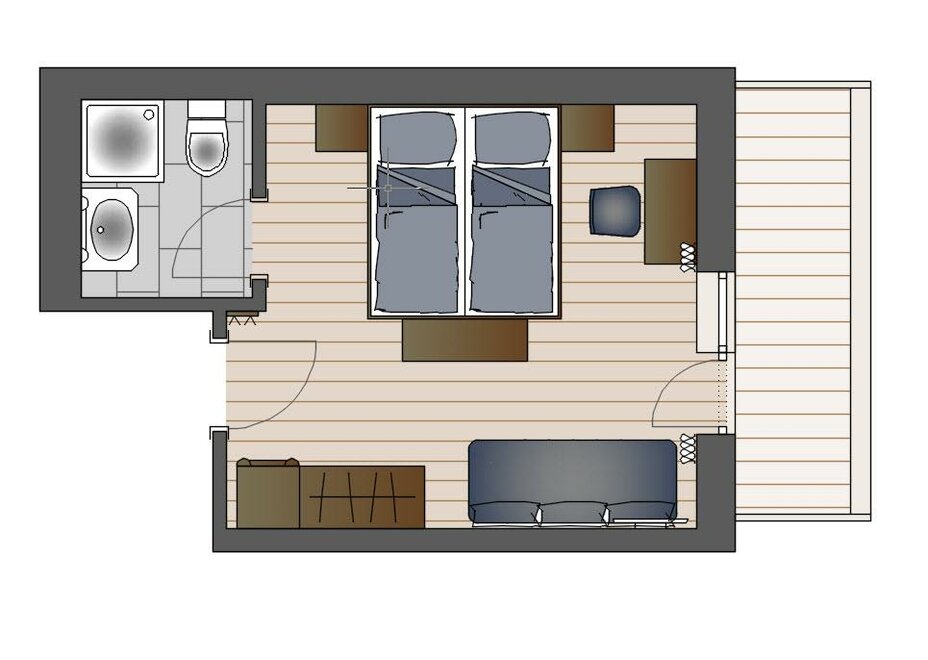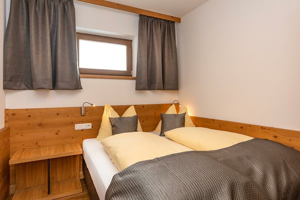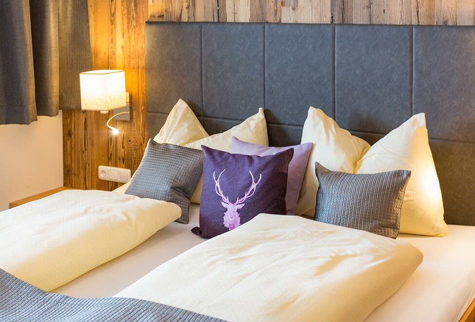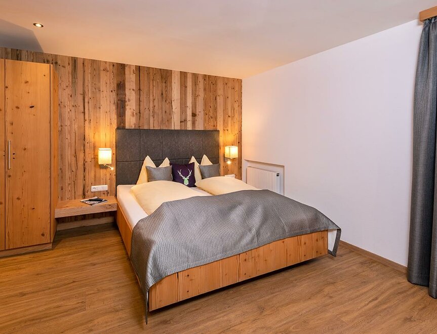 Moderní dvoulůžkový pokoj v alpském stylu pro 1 až 3 osoby se nachází v 1. patře, disponuje manželskou postelí (oddělitelnou) s otevřeným koncem a kvalitní pohovkou (přistýlka), TV, sprchou/WC a balkonem s výhledem na Bernkogel.