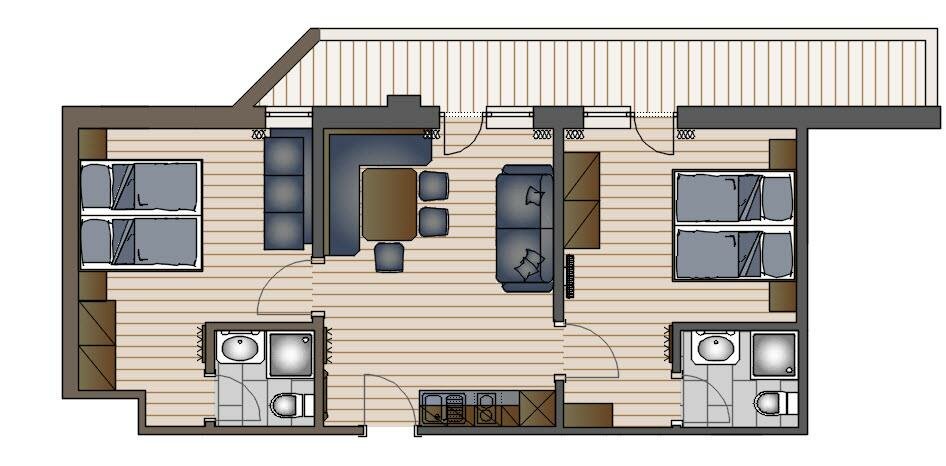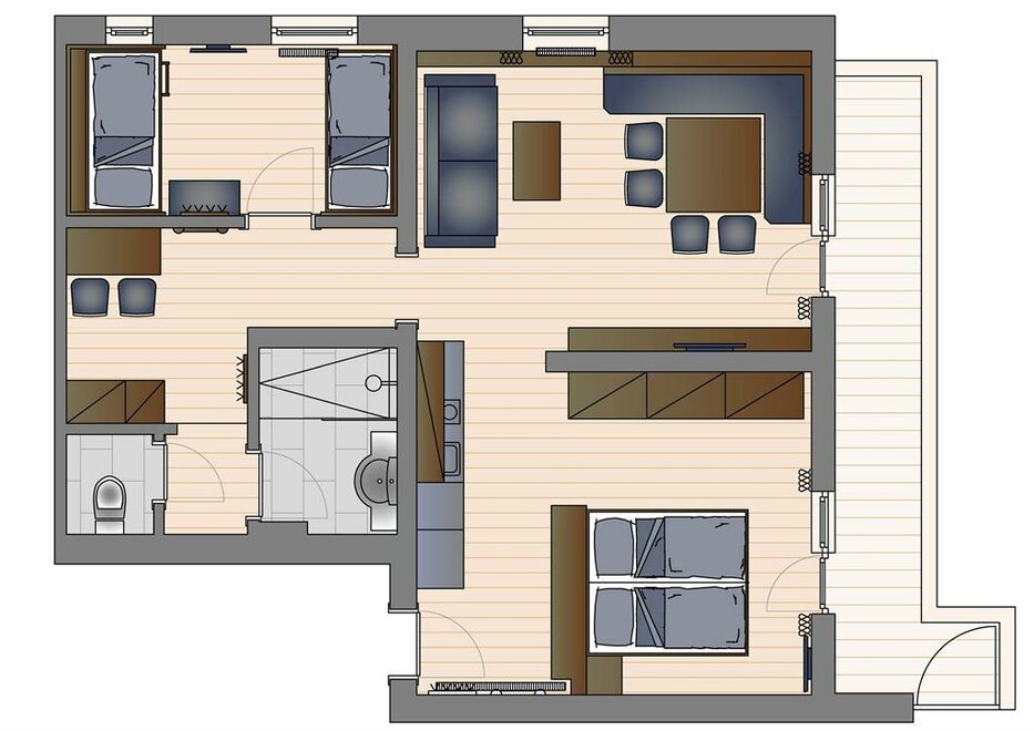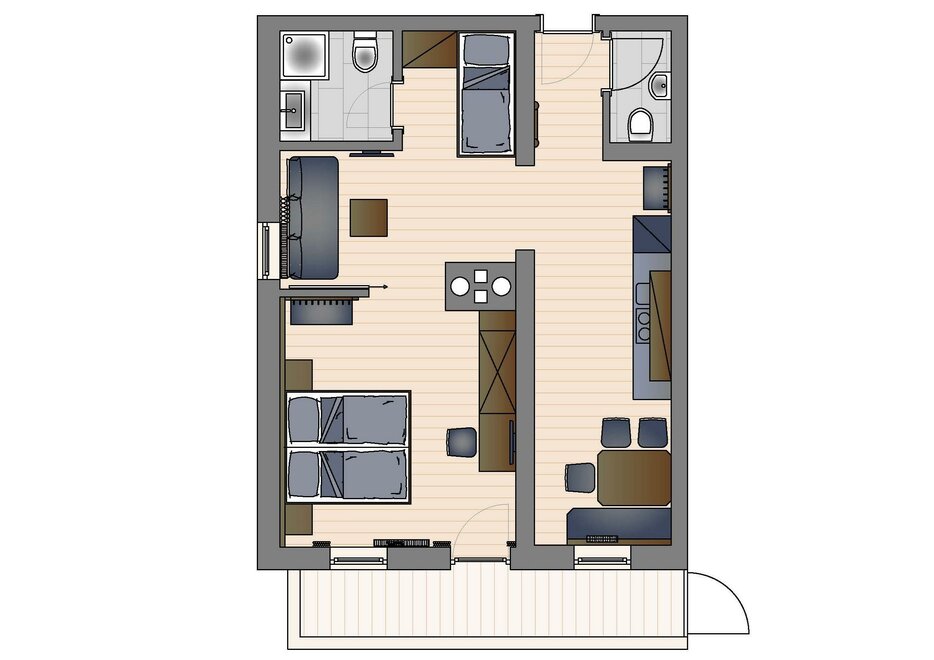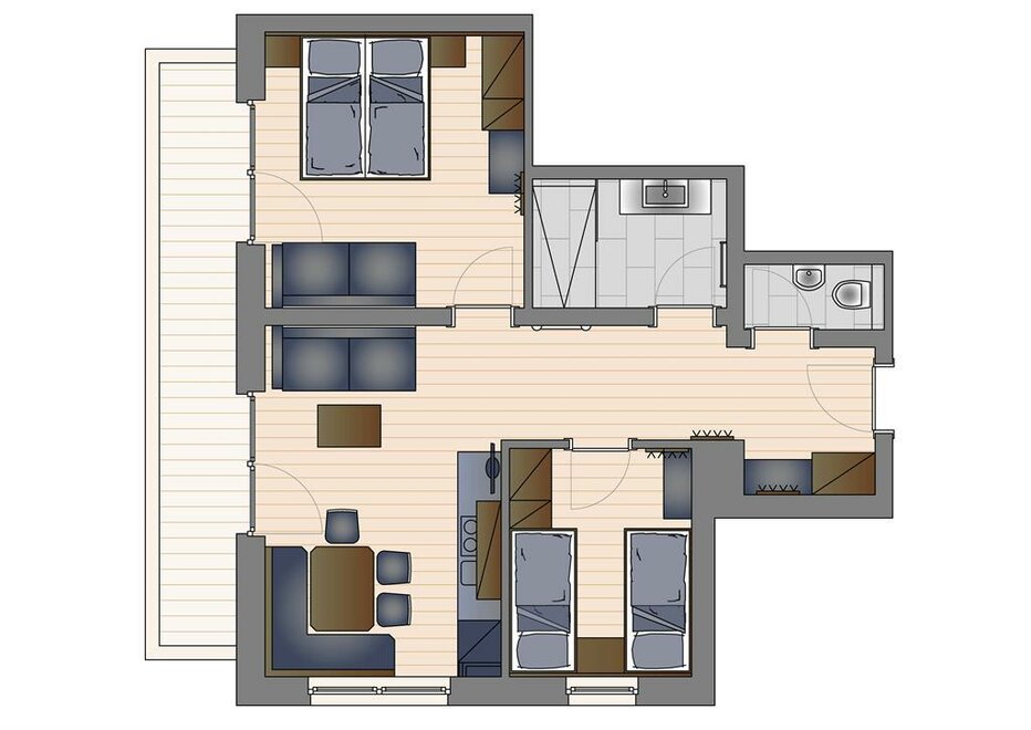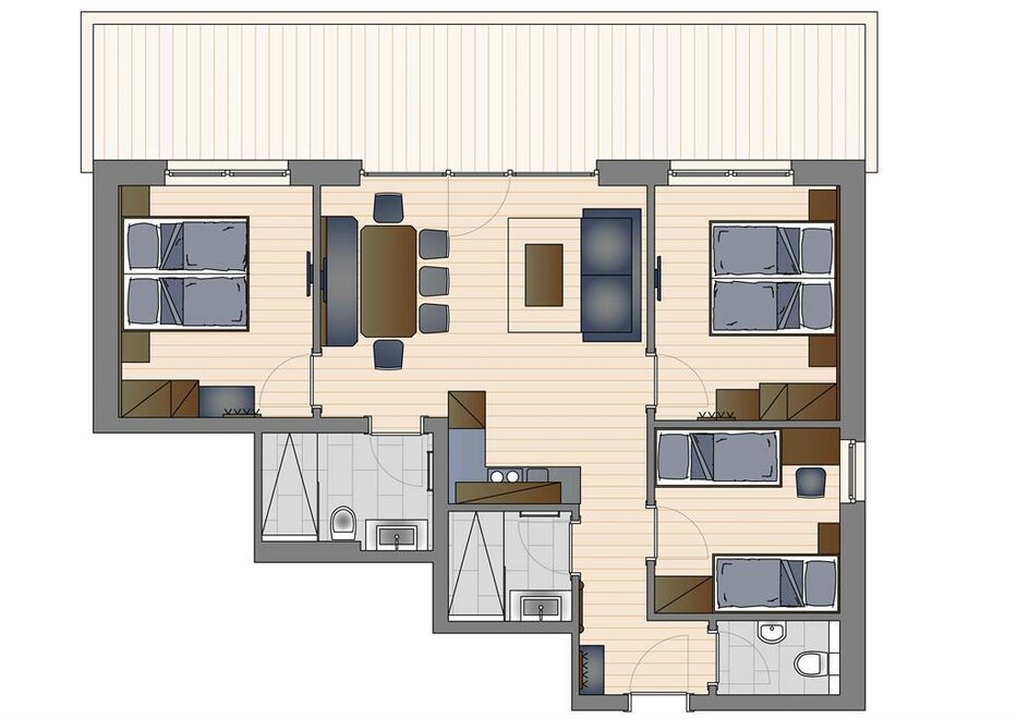 Apartmán Freiraum se nachází v klidné lokalitě ve 2. patře s velkou terasou a výhledem na Hochkeil. Disponuje zádveřím, třemi samostatnými ložnicemi se 2 manželskými postelemi a 2 jednolůžkovými postelemi, obývacím pokojem s útulným sedacím koutem, jídelním stolem a rozkládací pohovkou na spaní, plně vybavenou kuchyní včetně myčky nádobí, mikrovlnné trouby, kávovaru, ledničky, rychlovarné konvice…