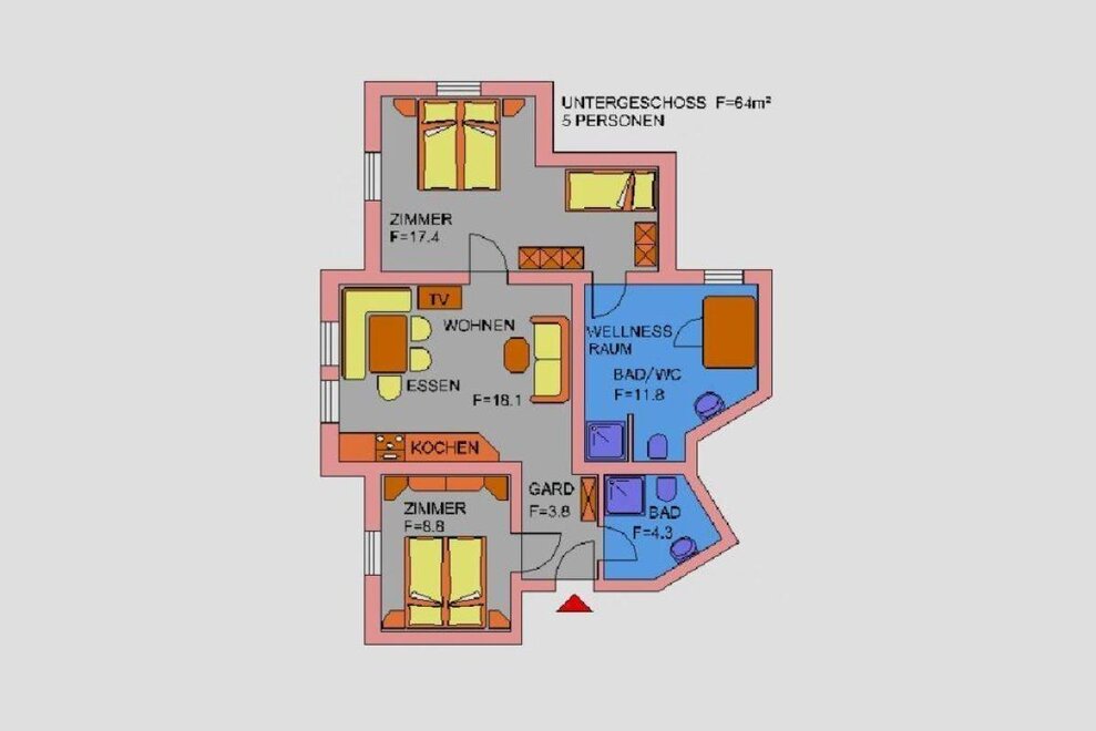 The apartment for 2 - 5 persons is located in the basement and has 2 bedrooms, a living room, kitchen with large dining table and dishwasher, electric stove, oven, refrigerator, microwave, coffee machine and kettle, 2 bathrooms with WC, flatscreen TV, CD player, WiFi and an infrared sauna.