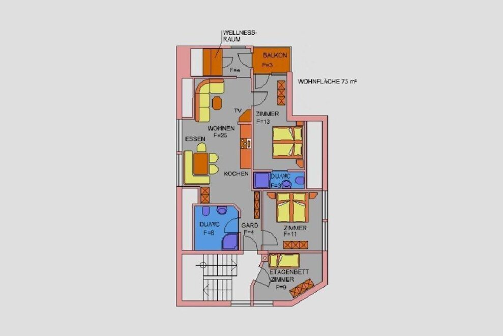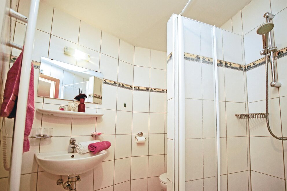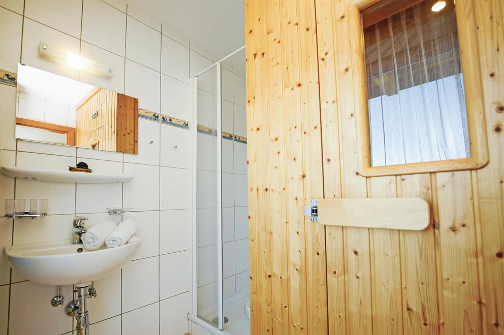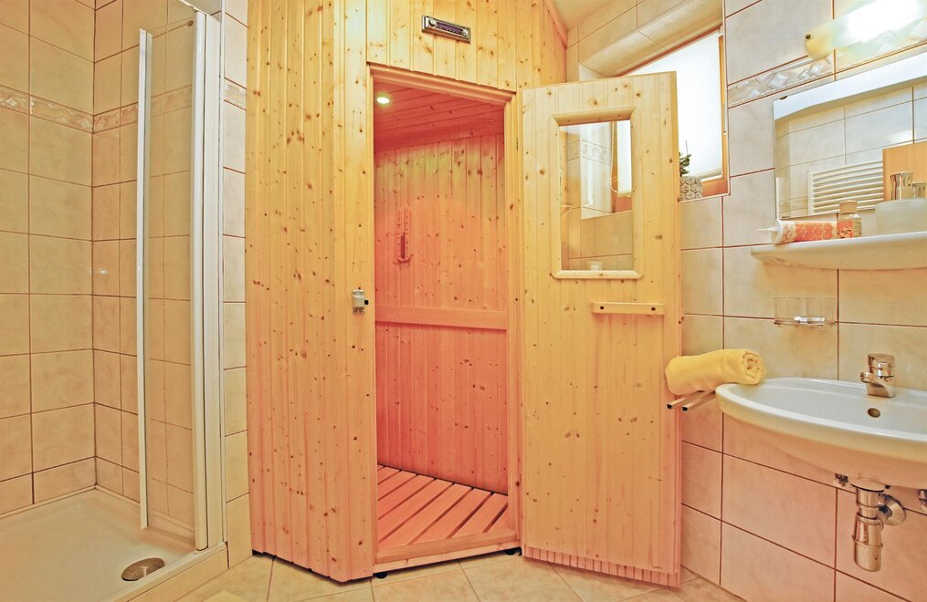 The apartment for 2 - 6 persons is located on the upper floor and has 3 bedrooms, a living room, kitchen with large dining table and dishwasher, electric stove, oven, refrigerator, microwave, coffee machine and kettle, 3 bathrooms, 2 WC, 2 flatscreen TVs, CD player, W-LAN, an infrared sauna and a balcony.