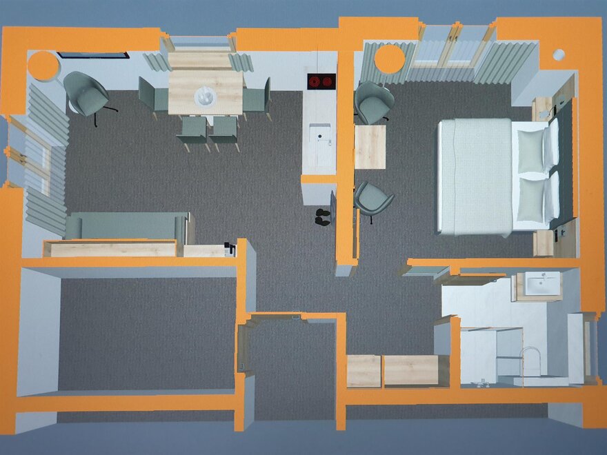 Útulný rodinný pokoj, vizuálně oddělený, žádné oddělené pokoje se světlou koupelnou.
