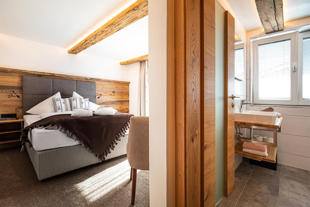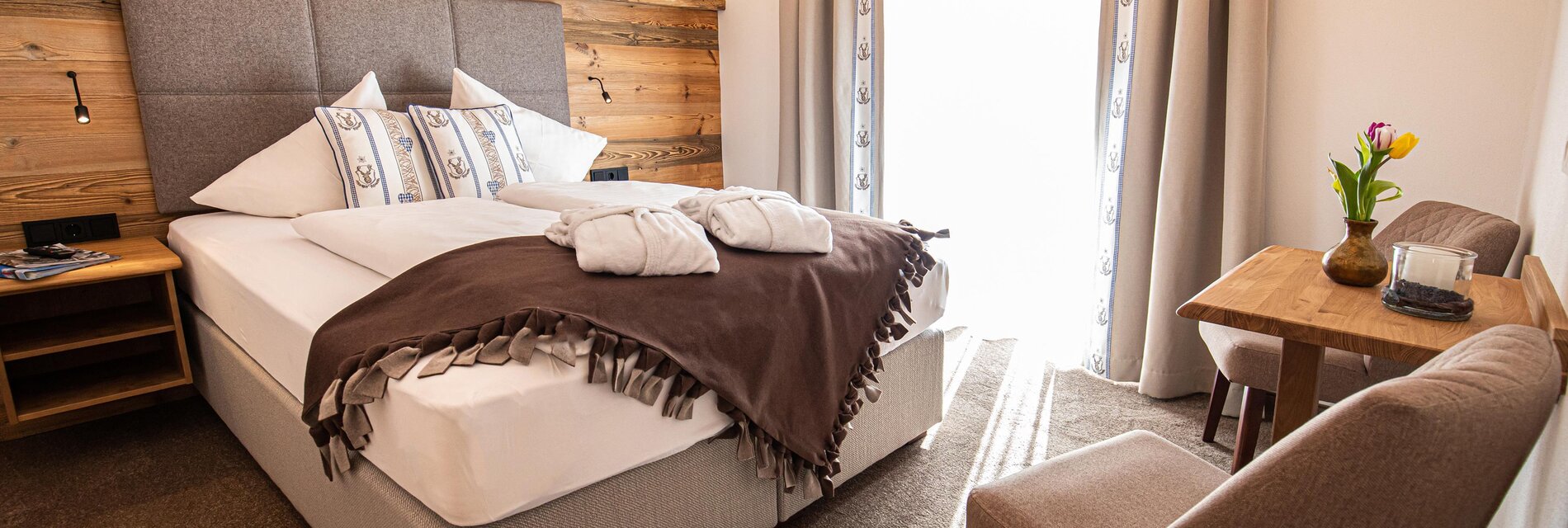 AplineChic Suite, ložnice s KingSize boxspring postelí a obývacím prostorem s exkluzivní postelí Flexino pro 2 až 3 osoby.