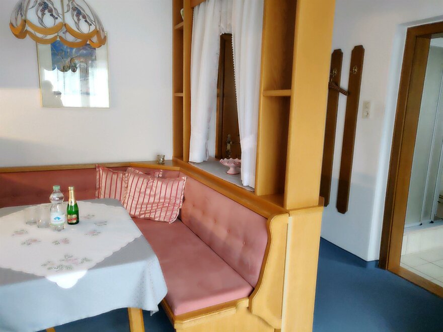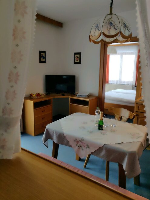 Apartment No. 1 on the ground floor with 37 m² consists of a bedroom with a double bed and built-in wardrobe. Living room with a pull-out double sofa bed and seating area for 4 people, TV with sideboard.