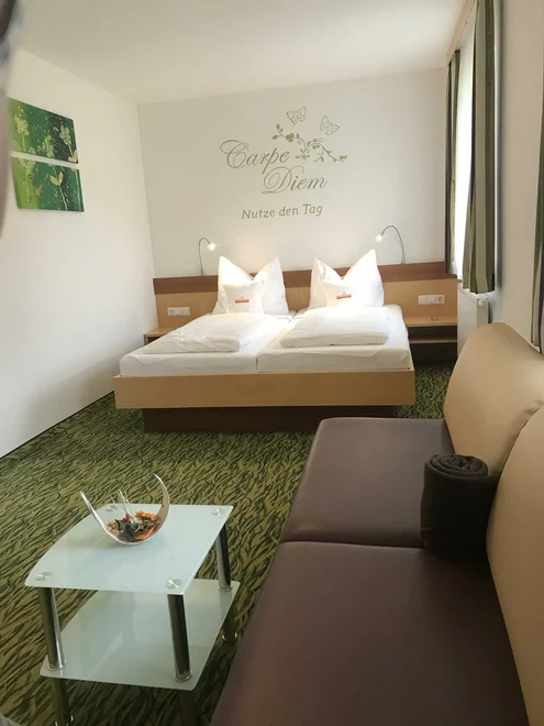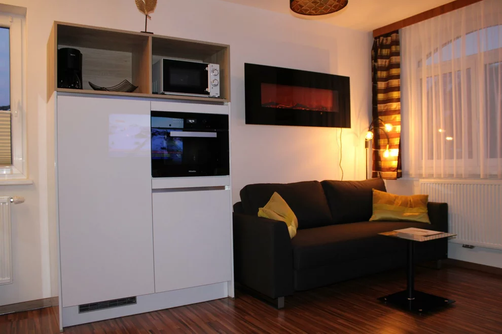 Apartmán typ A má 1 ložnici a 1 obytnou ložnici s kuchyní a jídelním koutem, balkon, TV, trezor, koupelnu se sprchou a infračervenou kabinou, WC oddělené.