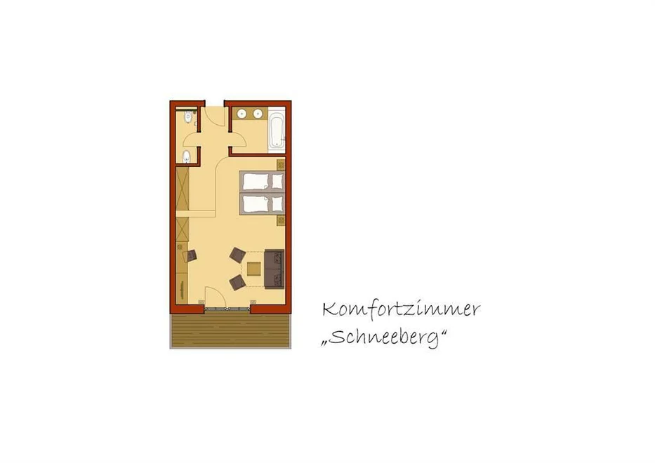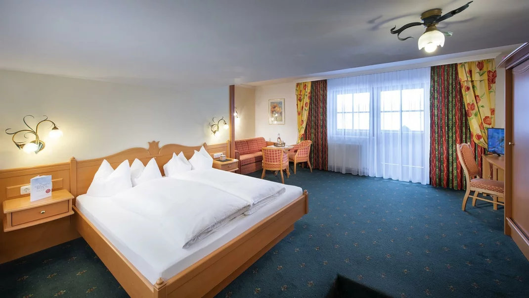 Prostorný pokoj se světlým nábytkem, pěkným posezením a prostornou koupelnou. Manželská postel s otevřeným čelem, schod v pokoji. Preferováno páry a rodinami s dětmi.Komfortní pokoj "Schneeberg" s slunným jižním balkonem a nádherným výhledem do údolí.