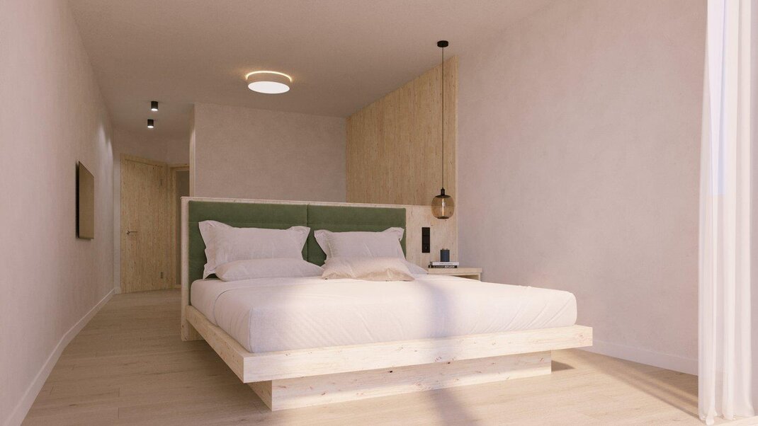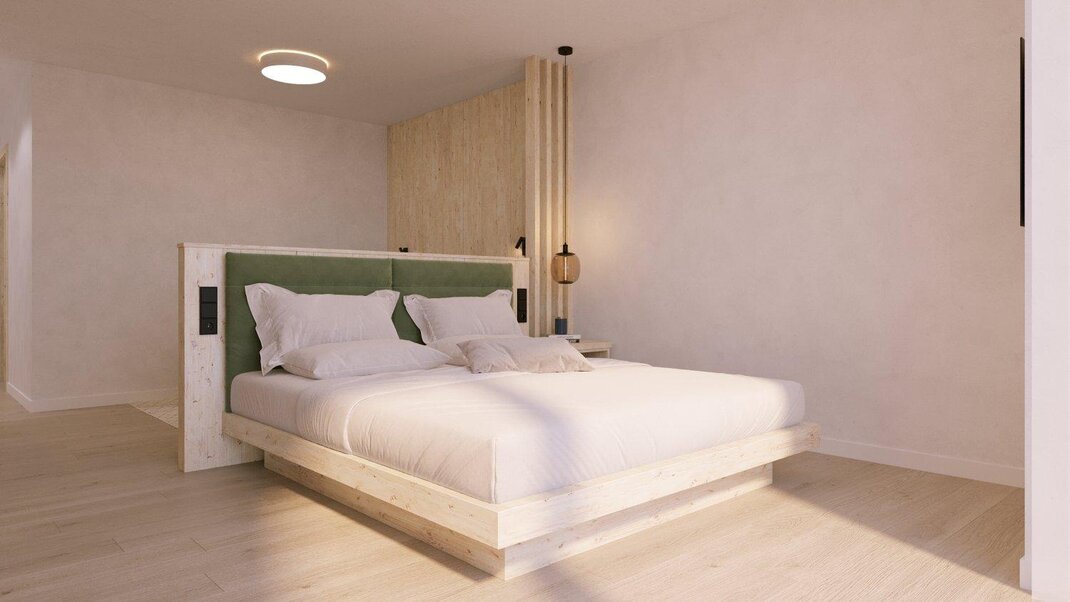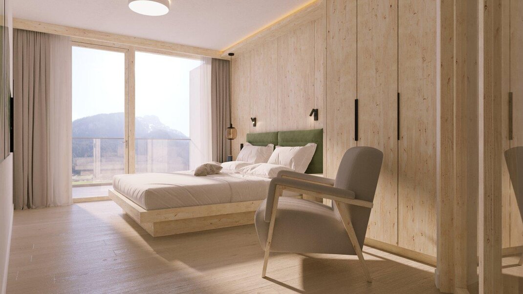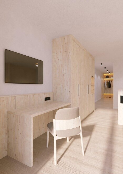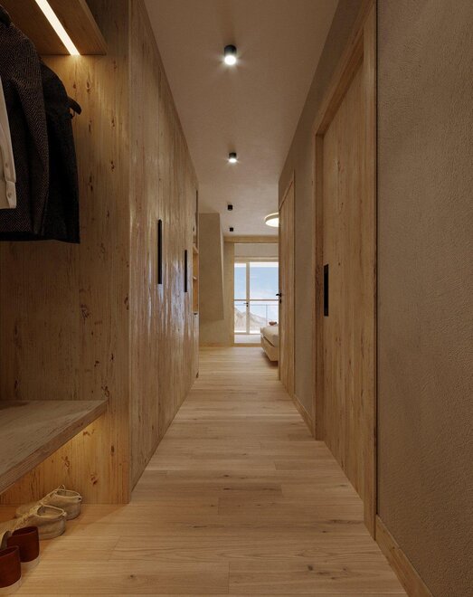 Pěkné, prostorné, světlé hotelové studio s odděleným obytným prostorem (sklápěcí dveře), balkonem, dubovými podlahami, koupelnou s bezbariérovým sprchovým koutem, odděleným WC, fénem, pracovním stolem, velkým televizorem, trezorem, širokopásmovým internetem, místem v podzemní garáži a panoramatickými skleněnými okny s výhledem na hory.