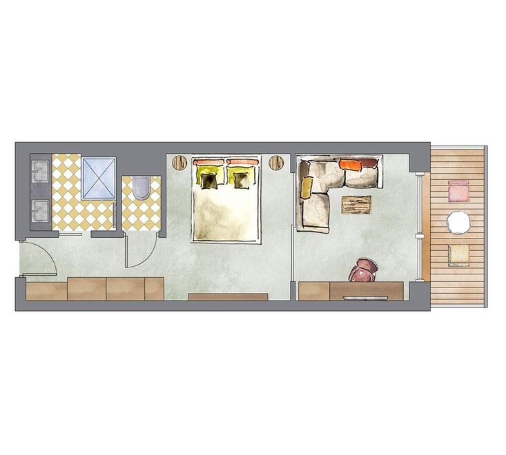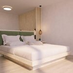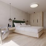 Krásný, prostorný dvoulůžkový pokoj 32 m² s opticky odděleným obývacím prostorem, balkonem, podlahou z dubového dřeva, koupelnou s bezbariérovým sprchovým koutem, rádiem a odděleným WC, fénem, psacím stolem, 48" kabelovou TV, trezorem, širokopásmovým internetem, telefonem, parkovacím místem v podzemní garáži a panoramatickým skleněným čelem ve 3. patře.