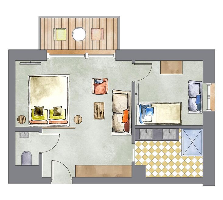 Krásný, prostorný dvoulůžkový pokoj s opticky oddělenou obývací částí a balkonem!