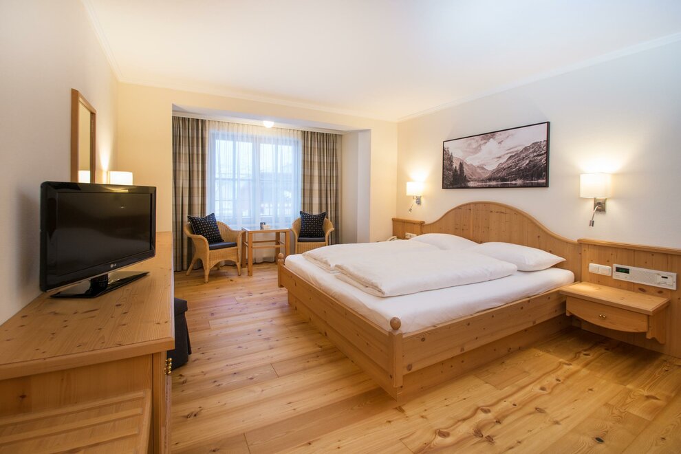 Bright and friendly room furnished with solid wood furniture