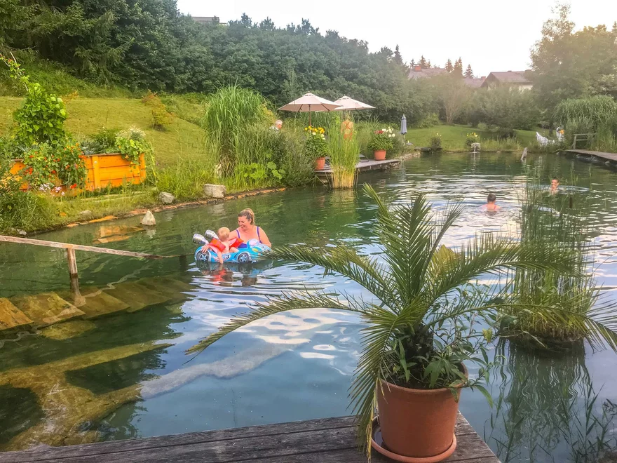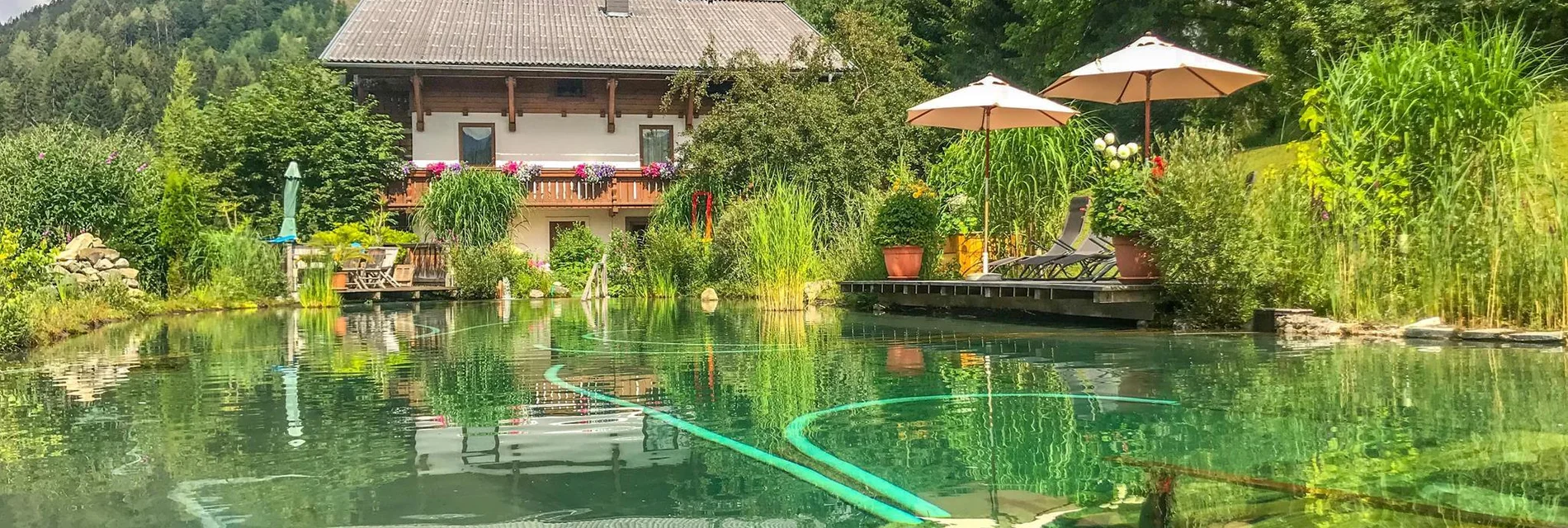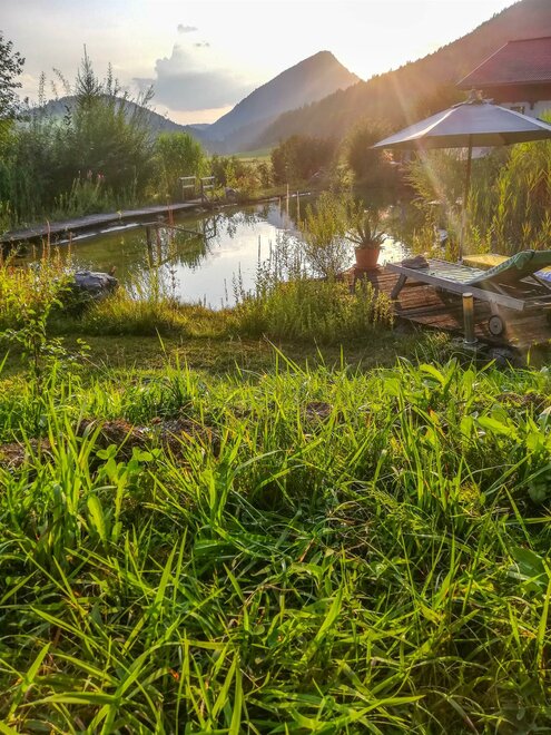 Další specialitou na Rapplhofu je naše koupací rybník, ve kterém se můžete v létě osvěžit. S rozměry 30 x 10 m téměř nic nebrání vašim přáním. Není nic krásnějšího než osvěžení v koupacím rybníku po dobrodružné túře v Schladminger Tauern nebo na Dachsteinu.