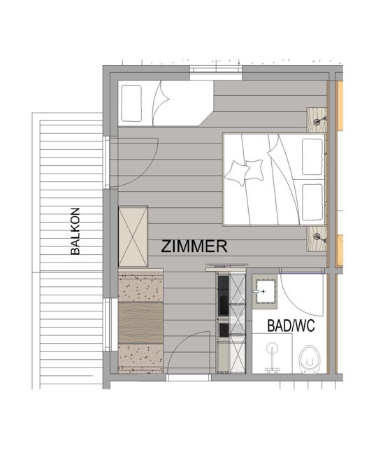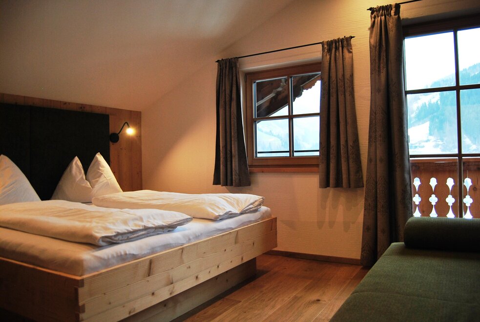 Dvojlůžkový pokoj s dřevěnými trámci, rozkládací pohovka, sprcha, WC, balkon, kabelová TV,