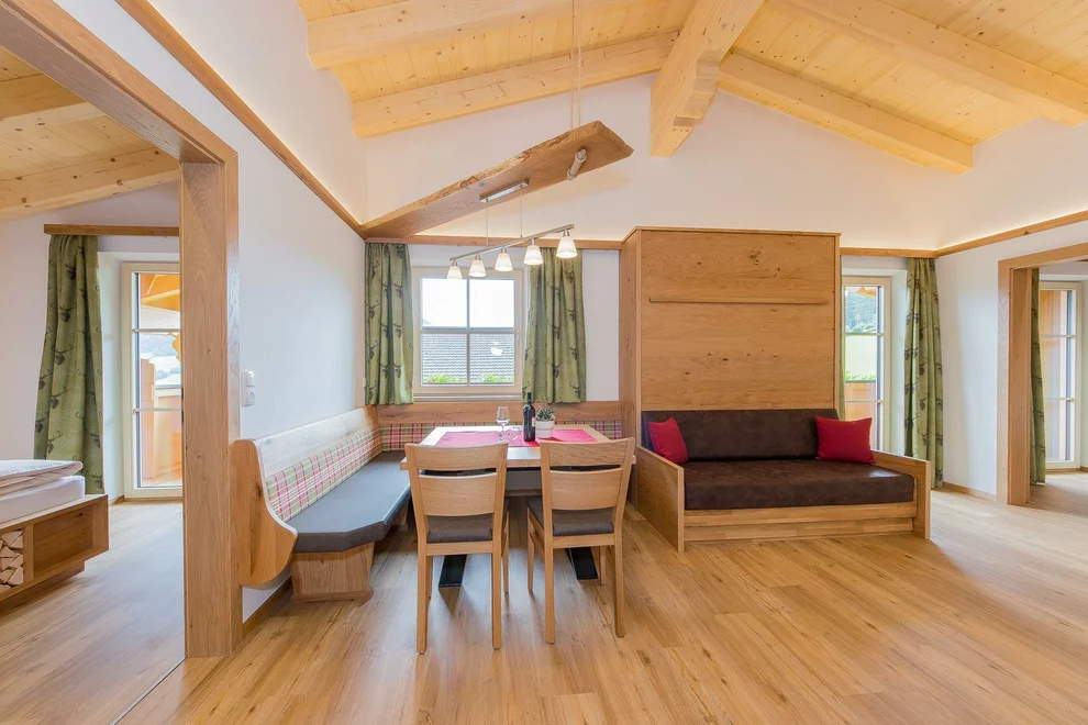 útulně zařízený obývací pokoj s jídelním koutem a komfortním spaním pro dvě osoby