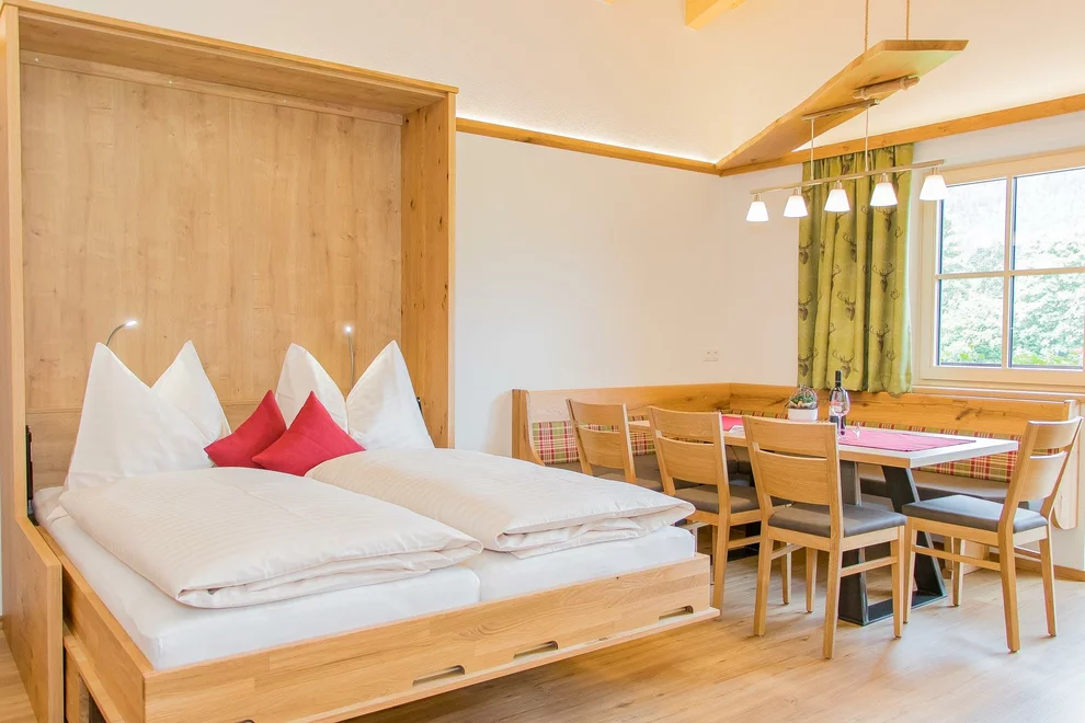 útulně zařízený obývací pokoj s jídelním koutem a spací komfort pro dvě osoby
