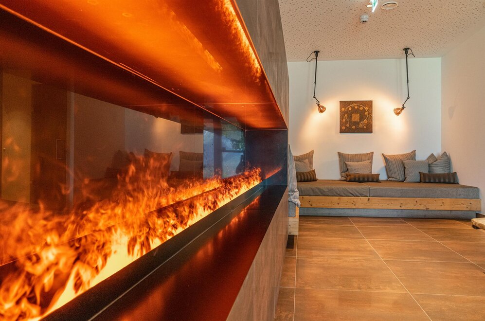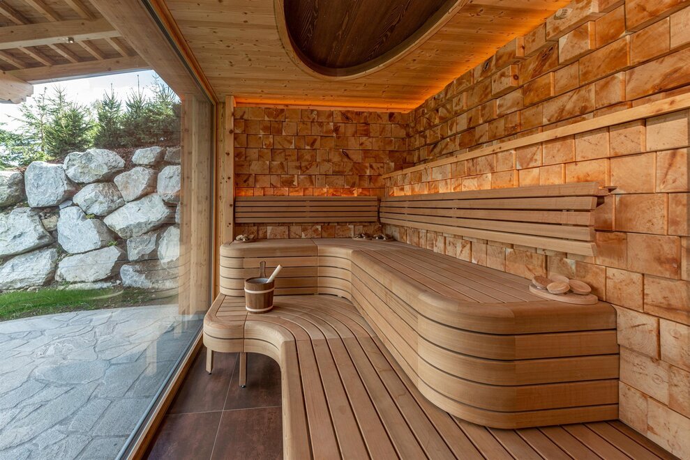 "Panorama - Spa" with finnish sky sauna, organic herb sauna, infrared cabin, rain shower, relaxation room, outdoor terrace, self-service tea lounge, fireplace & ice fountain