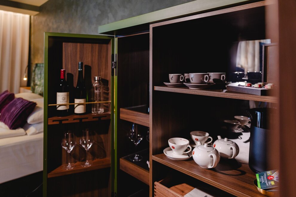 noa káva a čaj od Julius Meinl s kávovarem a varnou konvicí ve noa užitkovém skříni na pokoji