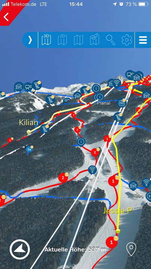 Nová funkce Friend-Tracker na fotorealistických 3D mapách ukazuje, kteří přátelé se zrovna pohybují v oblasti Ski amadé a především kde se nachází. Pokud se s přáteli v aplikaci propojíte, můžete se pak během dne na lyžích bez problémů (znovu) najít – pokud je aplikace otevřená na pozadí telefonu.