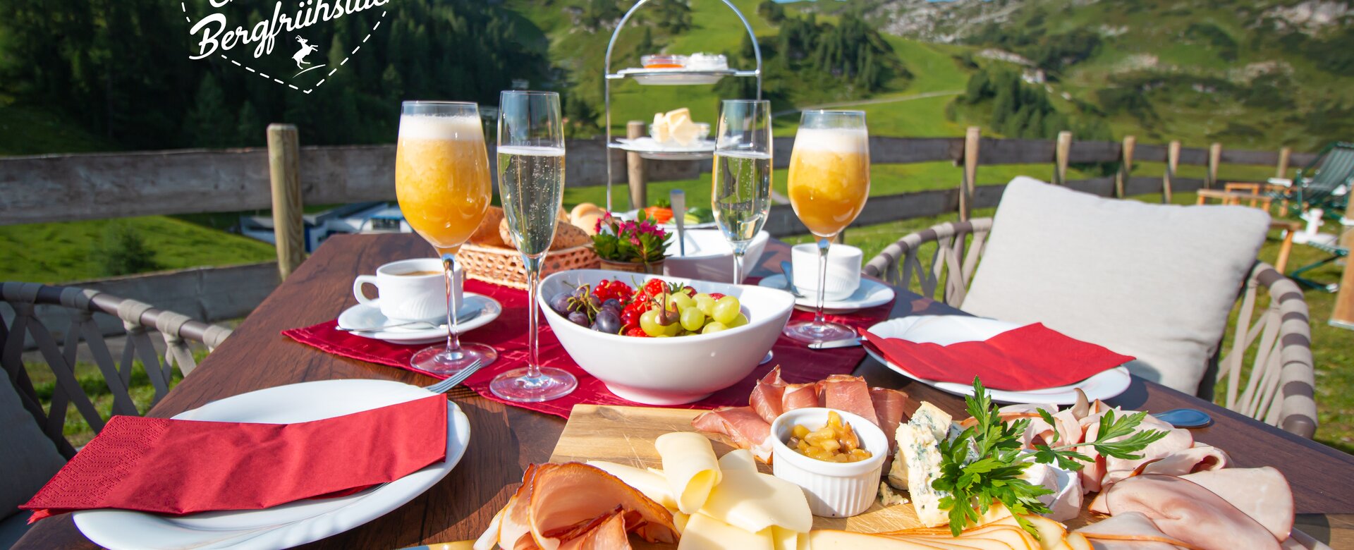 Frühstückstisch mit Käse, Schinken, Obst und Getränken vor Bergkulisse bei Sonne
