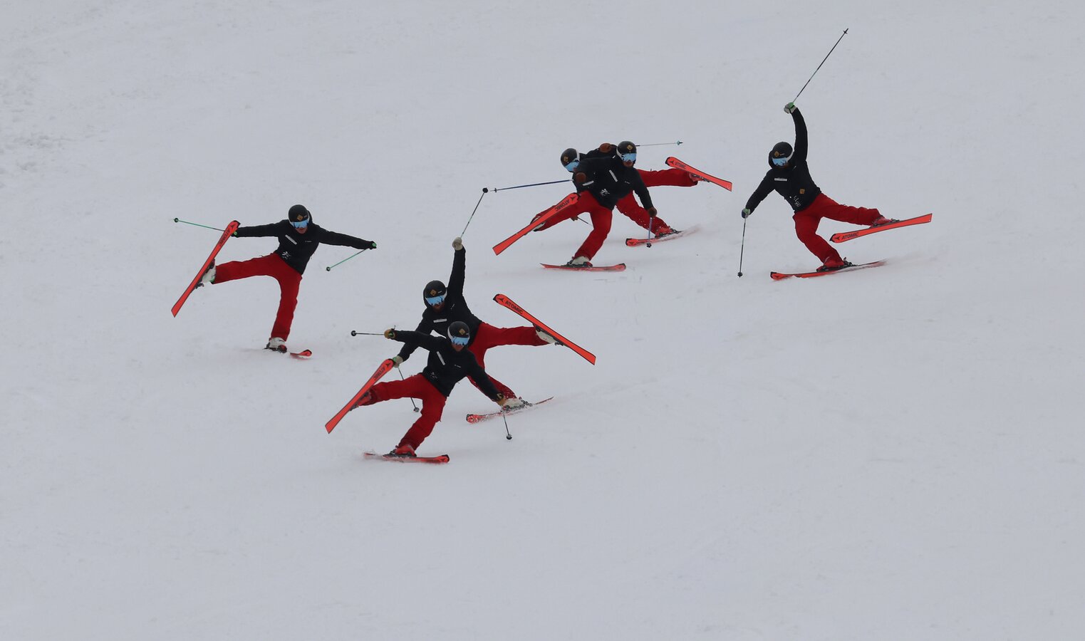 Fünf Skifahrer führen synchrone Hebefiguren mit ausgestreckten Armen und Beinen aus | © Michael Simonlehner