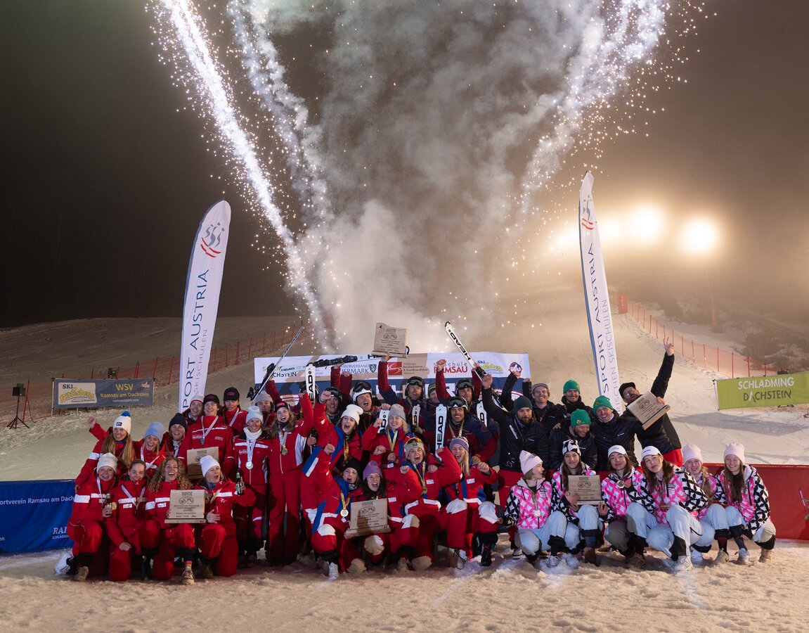 Große Siegergruppe posiert vor Feuerwerk und Bannern auf nächtlicher Skipiste | © Michael Simonlehner