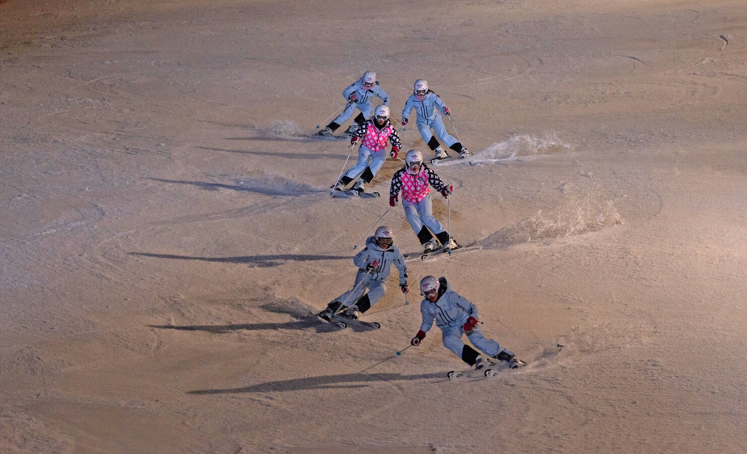 Sieben Skifahrer in Formation fahren abends bei Kunstlicht eine Skipiste hinunter | © Michael Simonlehner