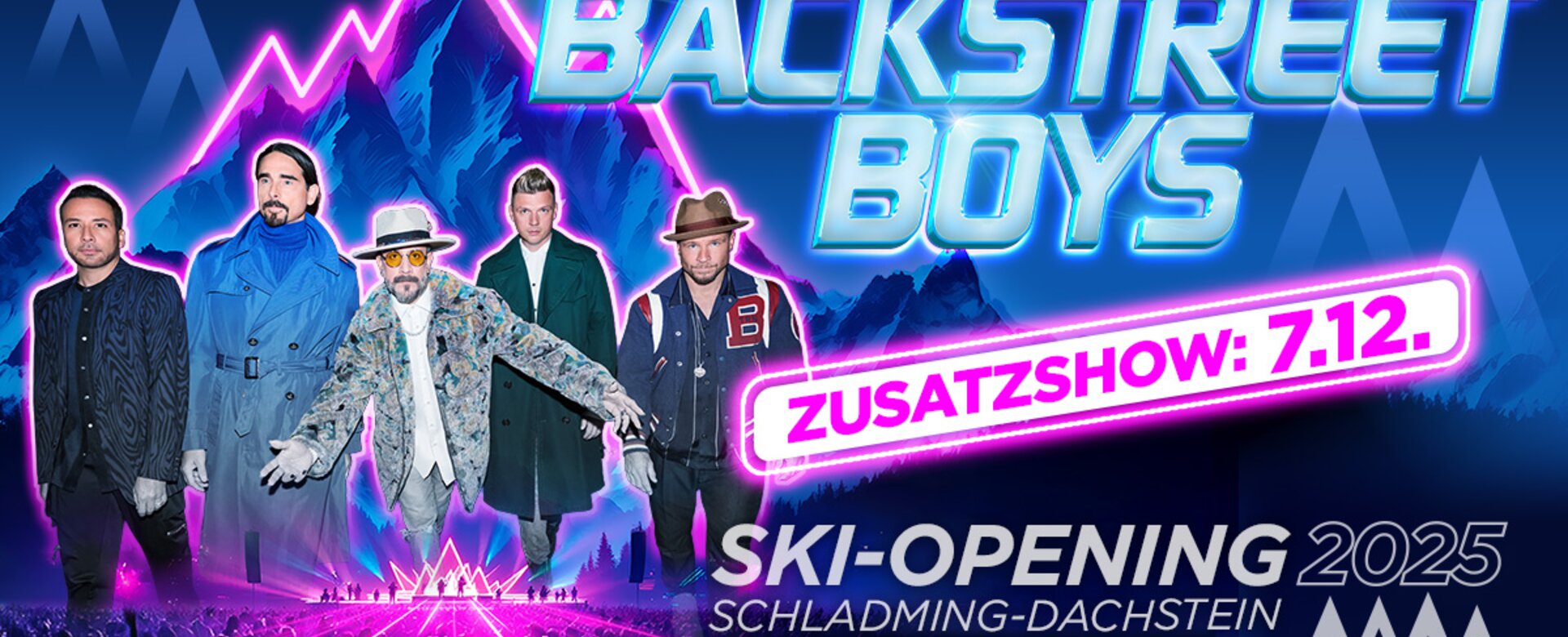 From 5 to 7 December 2025, Ski Opening Schladming-Dachstein will kick off the ski season with three concerts by the Backstreet Boys. The events will take place at the Planai Stadium in Schladming, with concerts on Friday, Saturday and Sunday at 5 p.m.