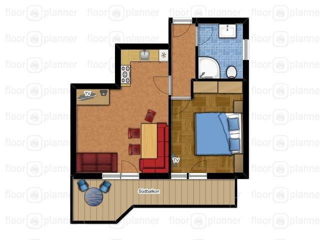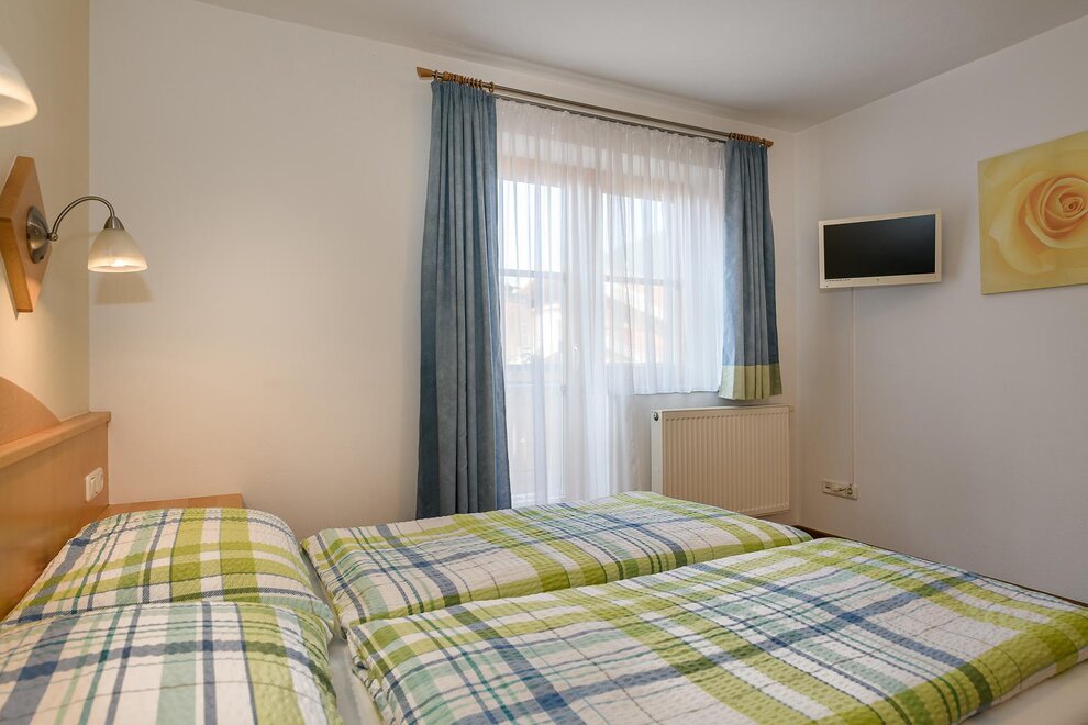Apartment with 1 bedroom and TV, livingkitchen with a couch and TV, bath and a big sunny balcony. Cleaning and the tax for adults are not incl.