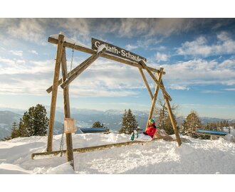 "Tempo raus, Genuss rein!" Am höchsten Punkt der Fageralm lädt die "Goliath Genuss-Oase" mit Riesenschaukel und Riesenliege zum genussvollen Verweilen ein. Die herrlichen Panoramablicke in die umliegende Bergwelt sind einzigartig.