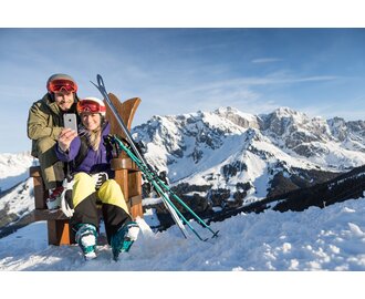 Zwei Skifahrer spielen die Ski amadé SENSATIONS-Challenge am Handy  | © Ski amadé
