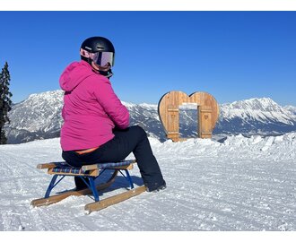 Beim Rodeln am Galsterberg ist ein herzlicher Moment garantiert. Die 5 km lange Naturrodelbahn bietet nicht nur rasanten Spaß, sondern auch einen perfekten Zwischenstopp mit einem traumhaften Fotopunkt, der eine atemberaubende Aussicht über das Ennstal eröffnet.