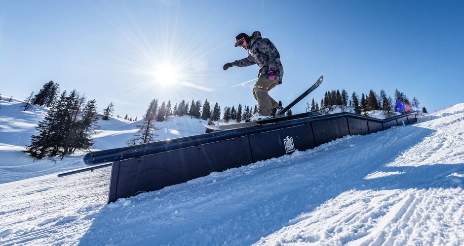 Snowpark Alpendorf – Das Highlight für Freestyler mit kreativen Obstacles und Lines.