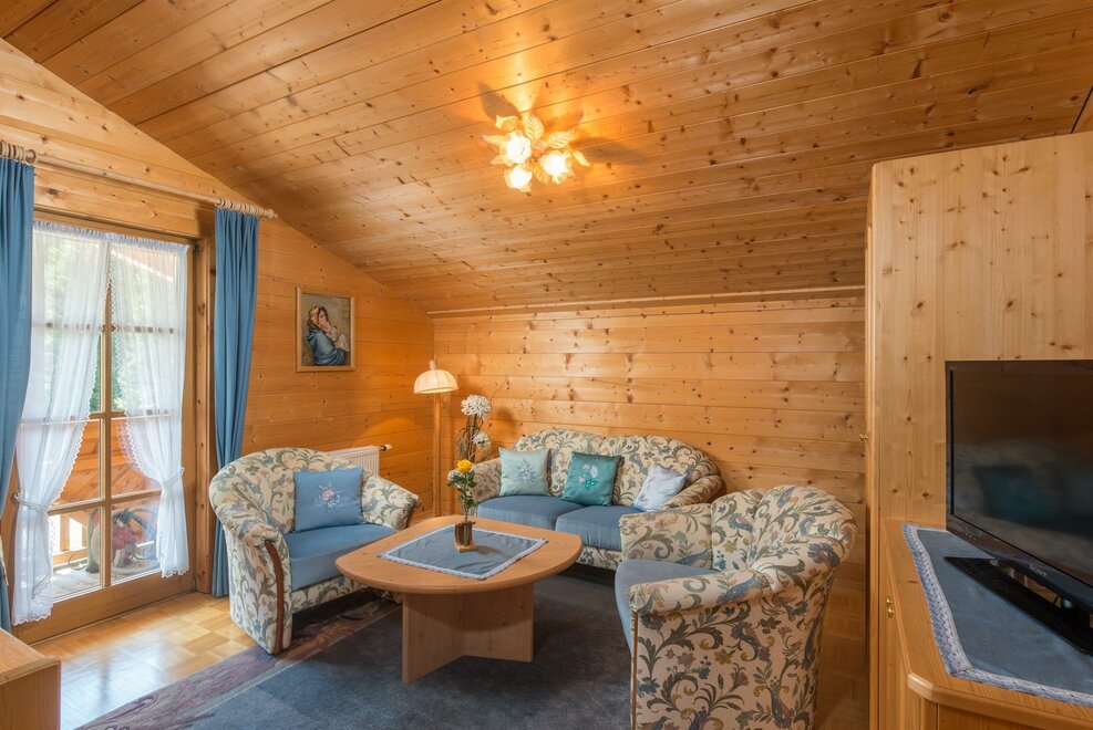 Sehr geräumiges Appartement mit einer Größe von 130 m2 . Besondere Gemütlichkeit mit Kachelofen in Vollholzblock mit Balkon und Bergblick in alle Himmelsrichtungen. Das Appartement erstreckt sich über die gesamte zweite Etage des Bio-Holz-Hauses.